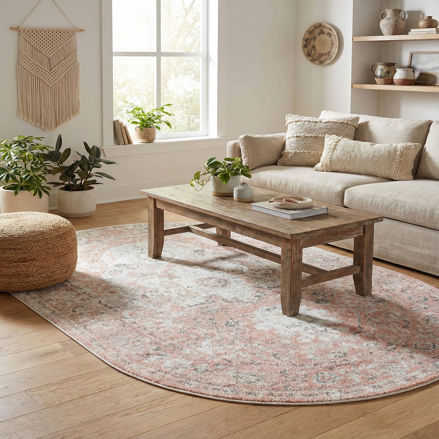 The oval shape makes it easy to place in entryways, at the foot of a bed, or beneath a small seating area or round table to soften hard edges. It pairs well with light wood furniture, linen upholstery, and muted brass or matte black accents — ideal for vintage-inspired, cottage, or transitional interiors that benefit from a warm, understated touch of color.
