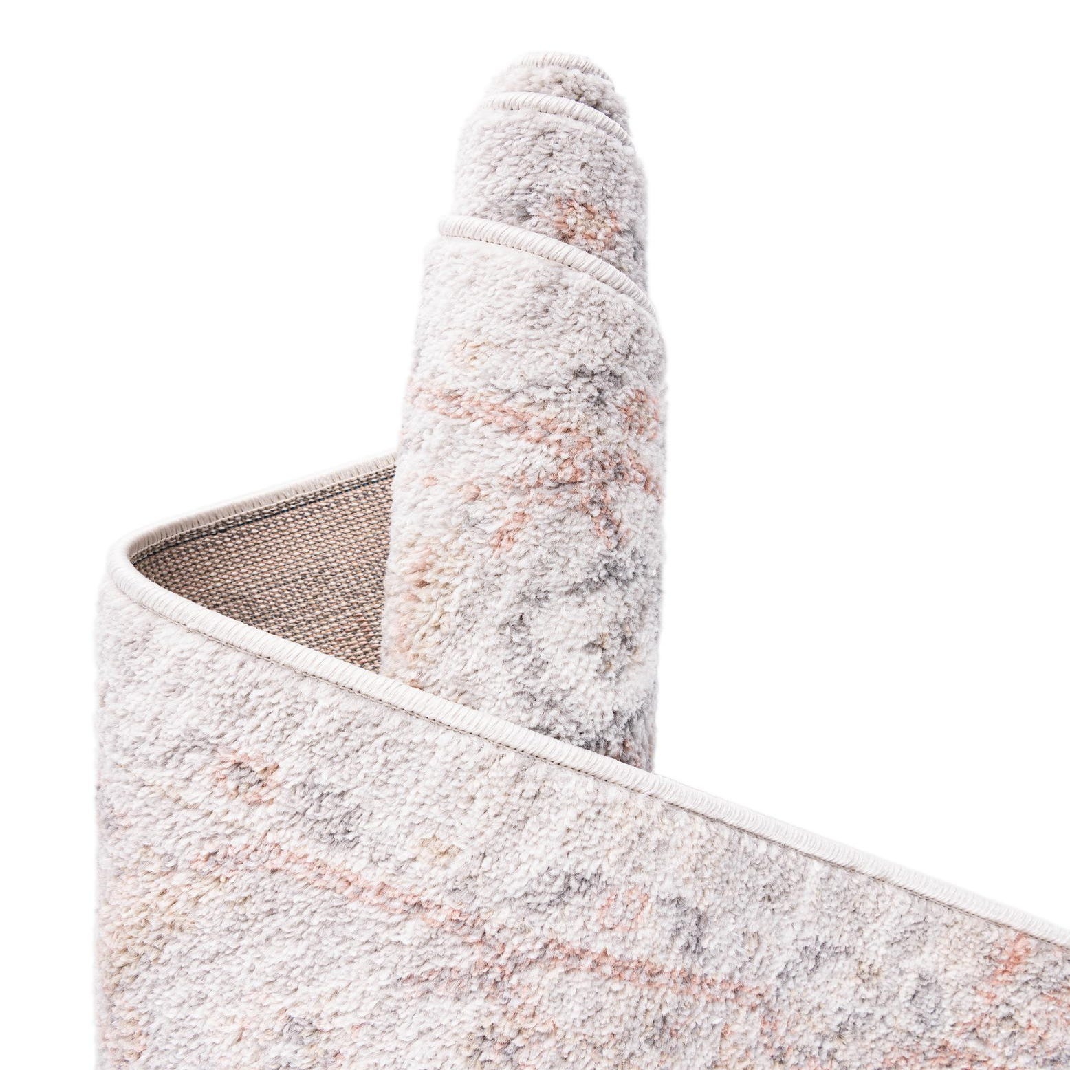 A vintage-inspired medallion pattern rests on a rose pink field, with ivory central motifs and soft gray outlines forming floral and arabesque details. The palette balances warm rose pink with neutral ivory and cool gray for a softly aged look, and the pattern’s faded areas create subtle variation that draws the eye without overpowering a room. Machine made of 100% polypropylene, the rug has a low, dense pile that feels smooth underfoot with gentle texture where the design is slightly raised.