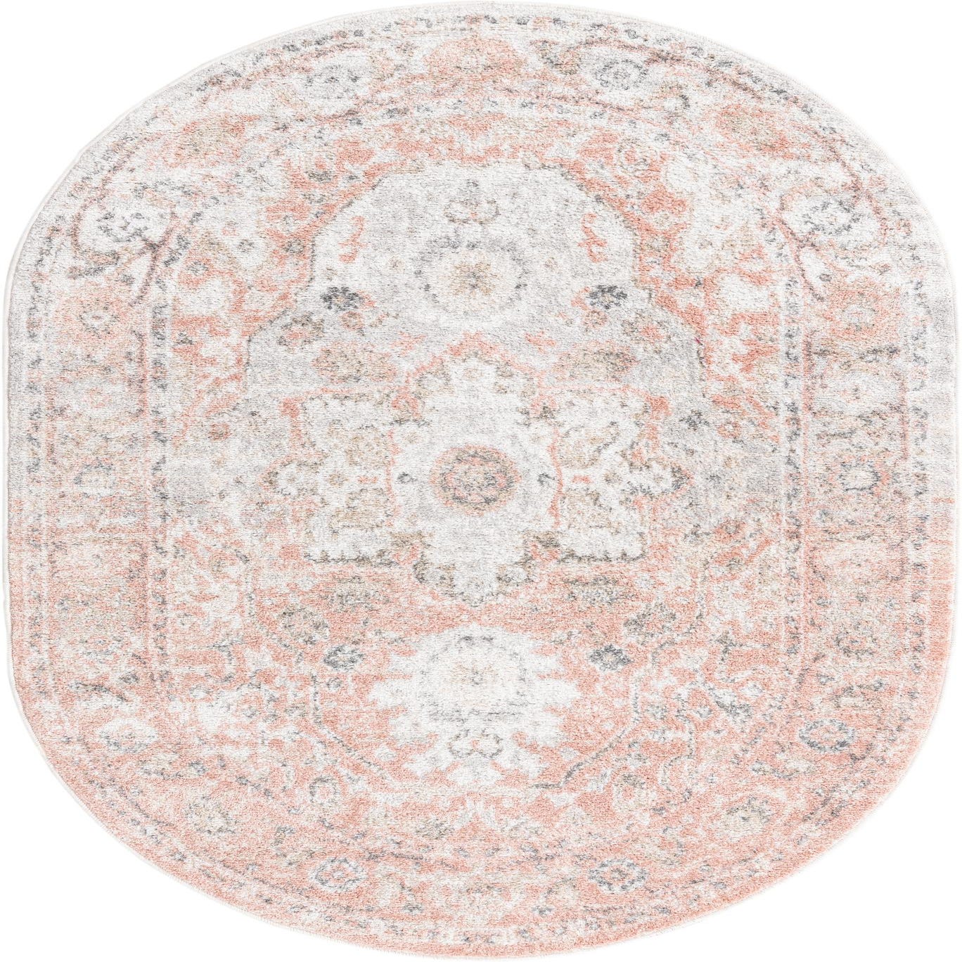 An oval 4' x 6' Madeline Vintage rug by Rugs.com, featuring a faded traditional medallion pattern in pinks, reds, and grays on a light background.