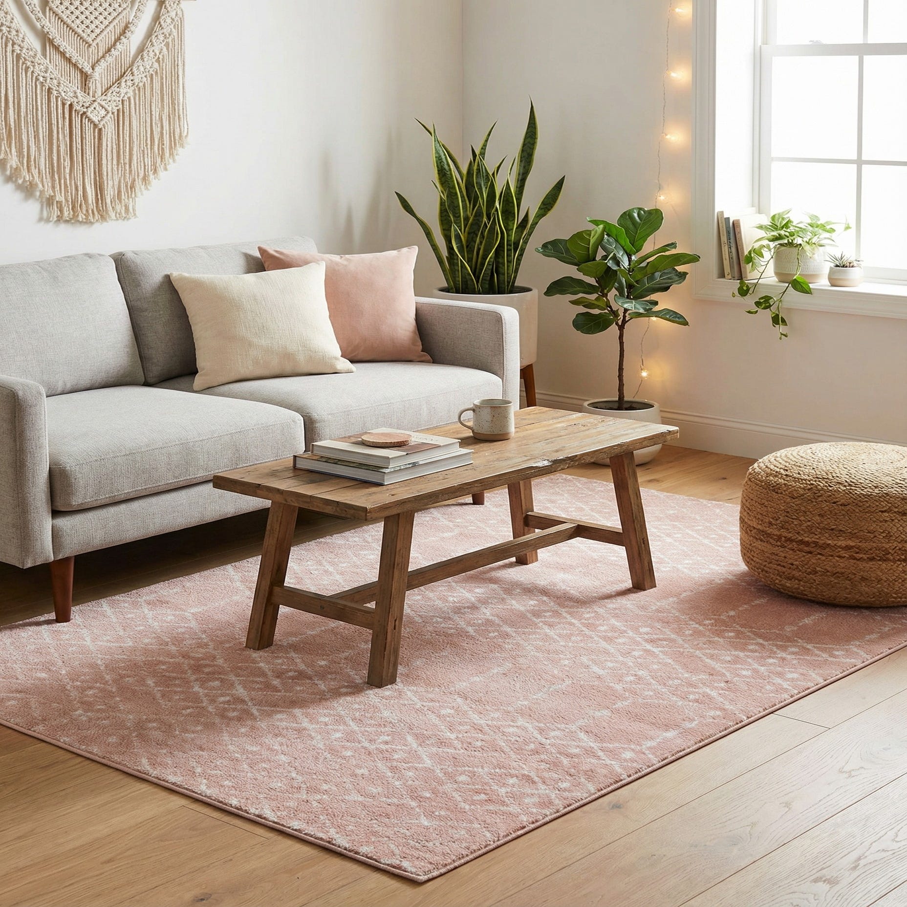 This rug pairs naturally with light wood or painted furniture, muted metallics, and linens in cream or blush tones for a cohesive, layered feel. Use it to anchor a bedroom or nursery, add a gentle pop of color to a living area, or soften a reading nook or dressing space. Its blend of pattern and color suits modern farmhouse, contemporary, and soft-bohemian interiors.