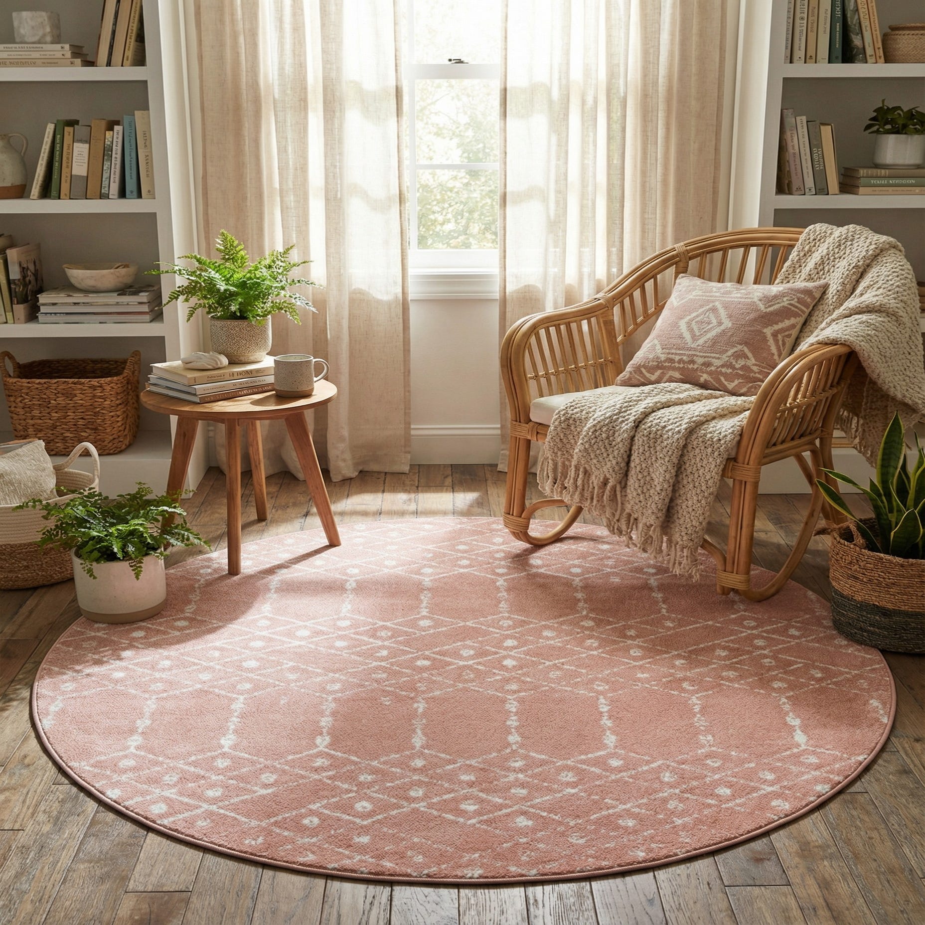 A soft rose pink field sets the tone for this round rug, where an ivory trellis pattern weaves across the surface in a repeating diamond lattice accented with small dot motifs. The balanced geometric layout has a contemporary-yet-timid character that pairs a modern trellis aesthetic with a subtle, almost hand-crafted look. Machine made from 100% polypropylene, the rug has a low-pile construction that feels smooth and slightly cushioned underfoot while keeping the pattern crisp and well-defined.