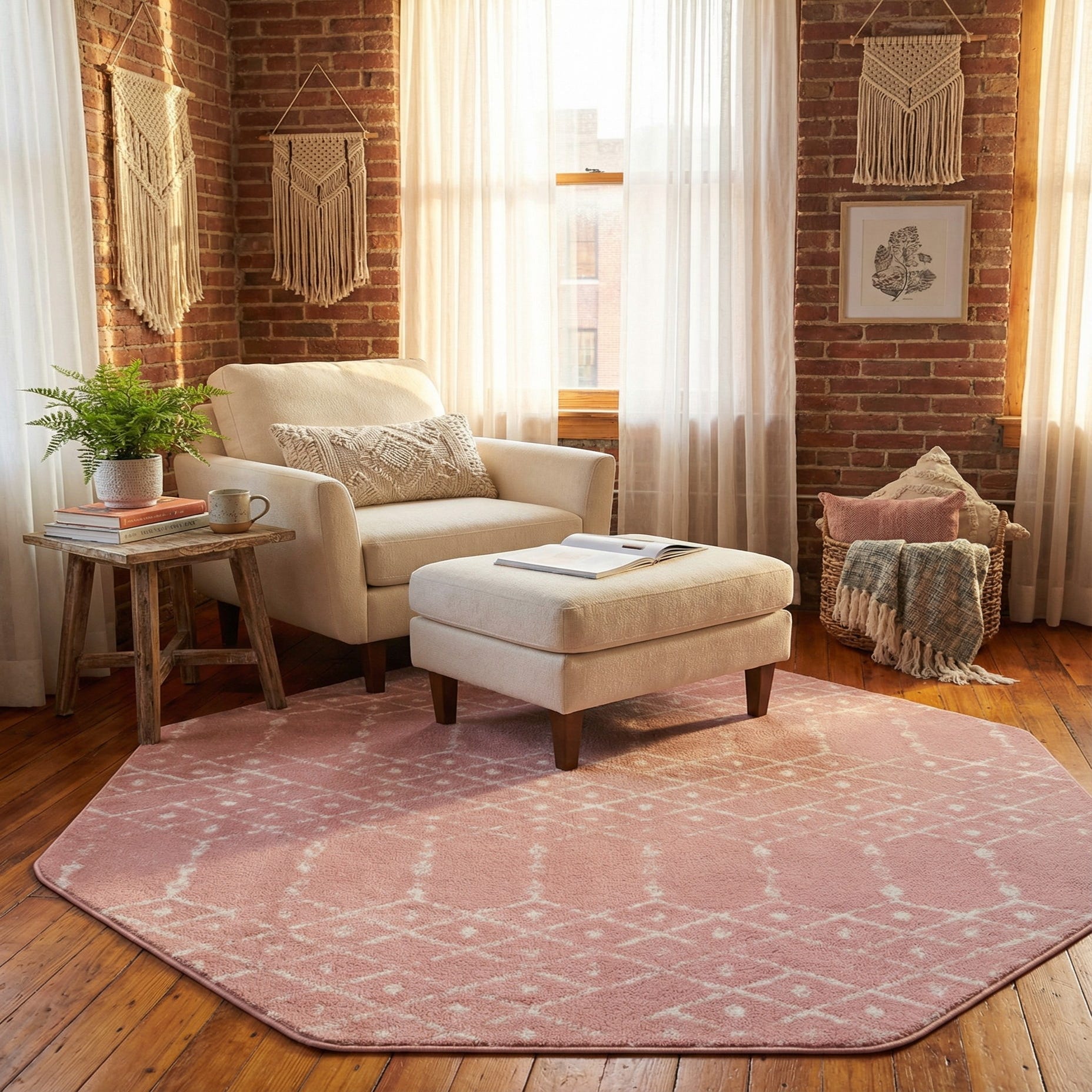 A soft rose pink field sets a warm, modern tone, overlaid with an ivory trellis pattern that repeats in slightly distressed, hand-drawn lines. The octagonal silhouette gives the design a subtle architectural presence while the geometric motif keeps the look contemporary and approachable. Woven from 100% polypropylene, the pile is low and smooth with a gentle cushion underfoot, offering a velvety touch that highlights the soft color contrast between the rose and ivory.