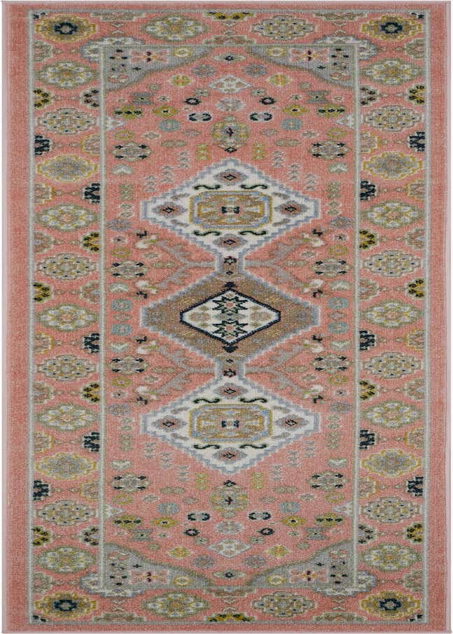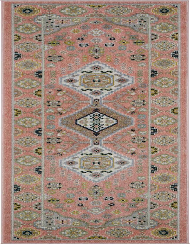 Primary color is Rose Pink. Colors in this rug include: Rose Pink, Beige, Ivory, Green, Gray, Light Blue.