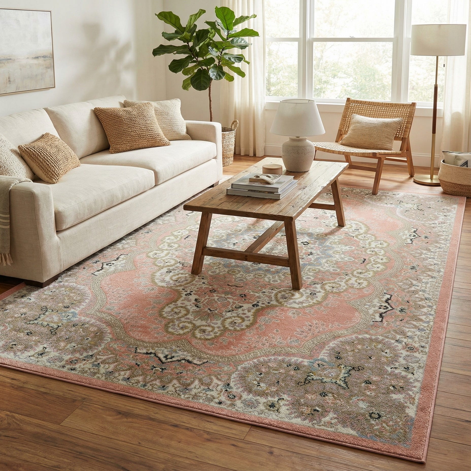 Primary color is Rose Pink. Colors in this rug include: Rose Pink, Beige, Ivory, Light Blue.