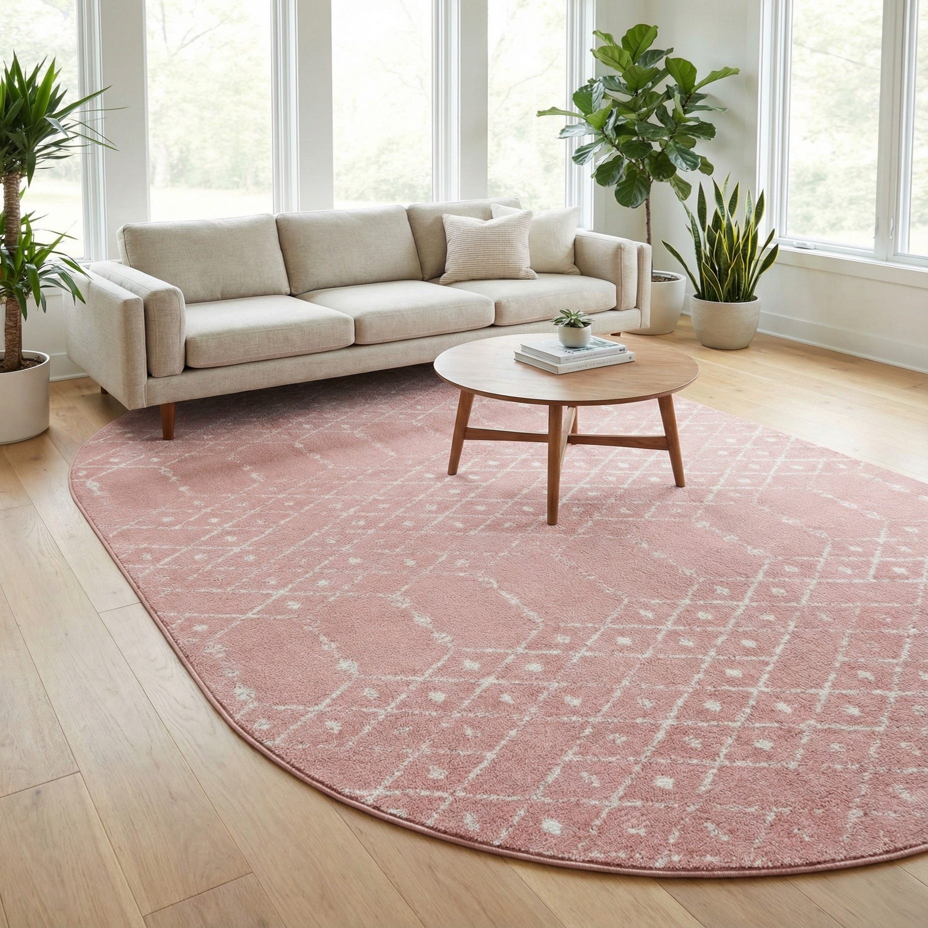 An oval 6'1" x 9'0" pink area rug with a modern tribal trellis pattern in white, suitable for indoor spaces.