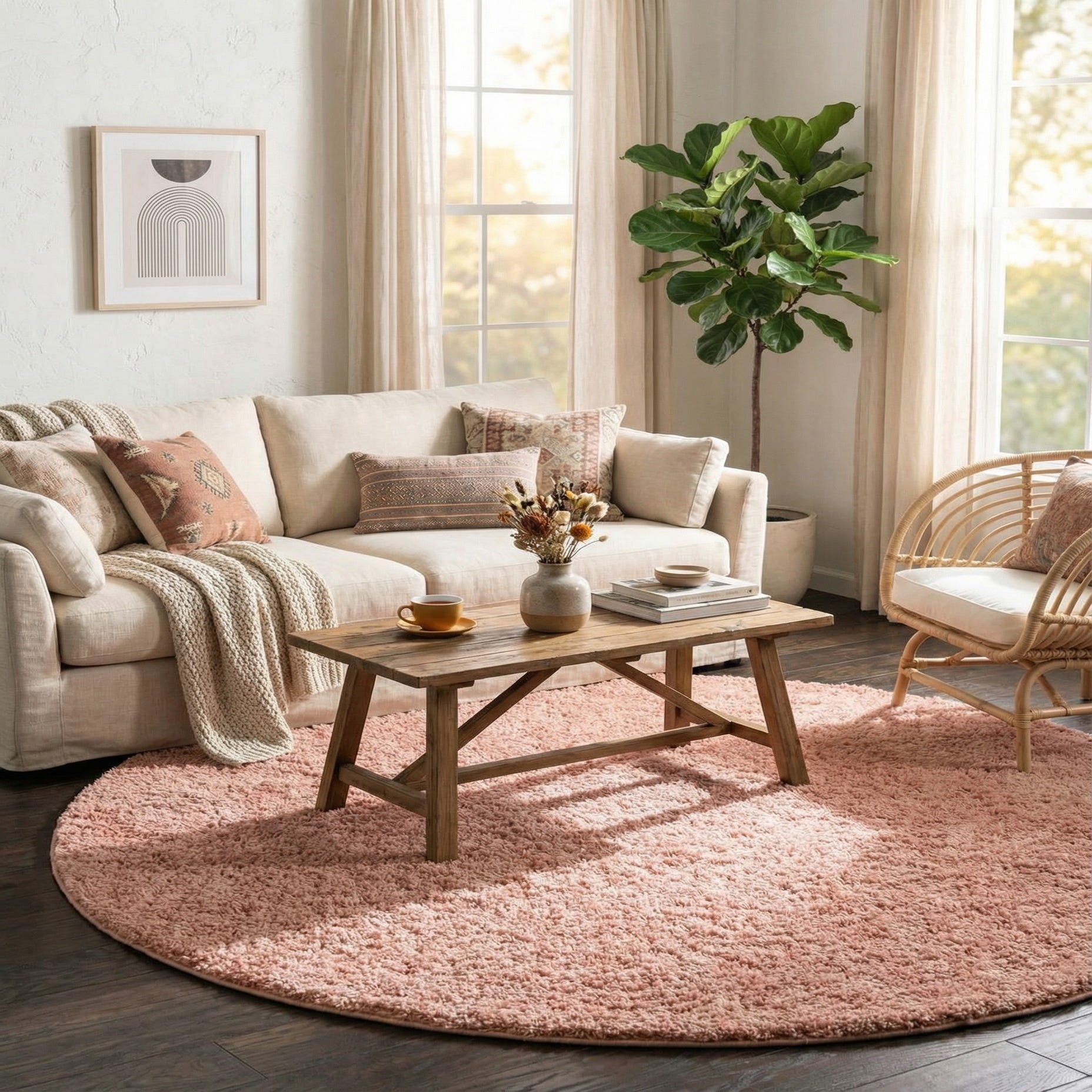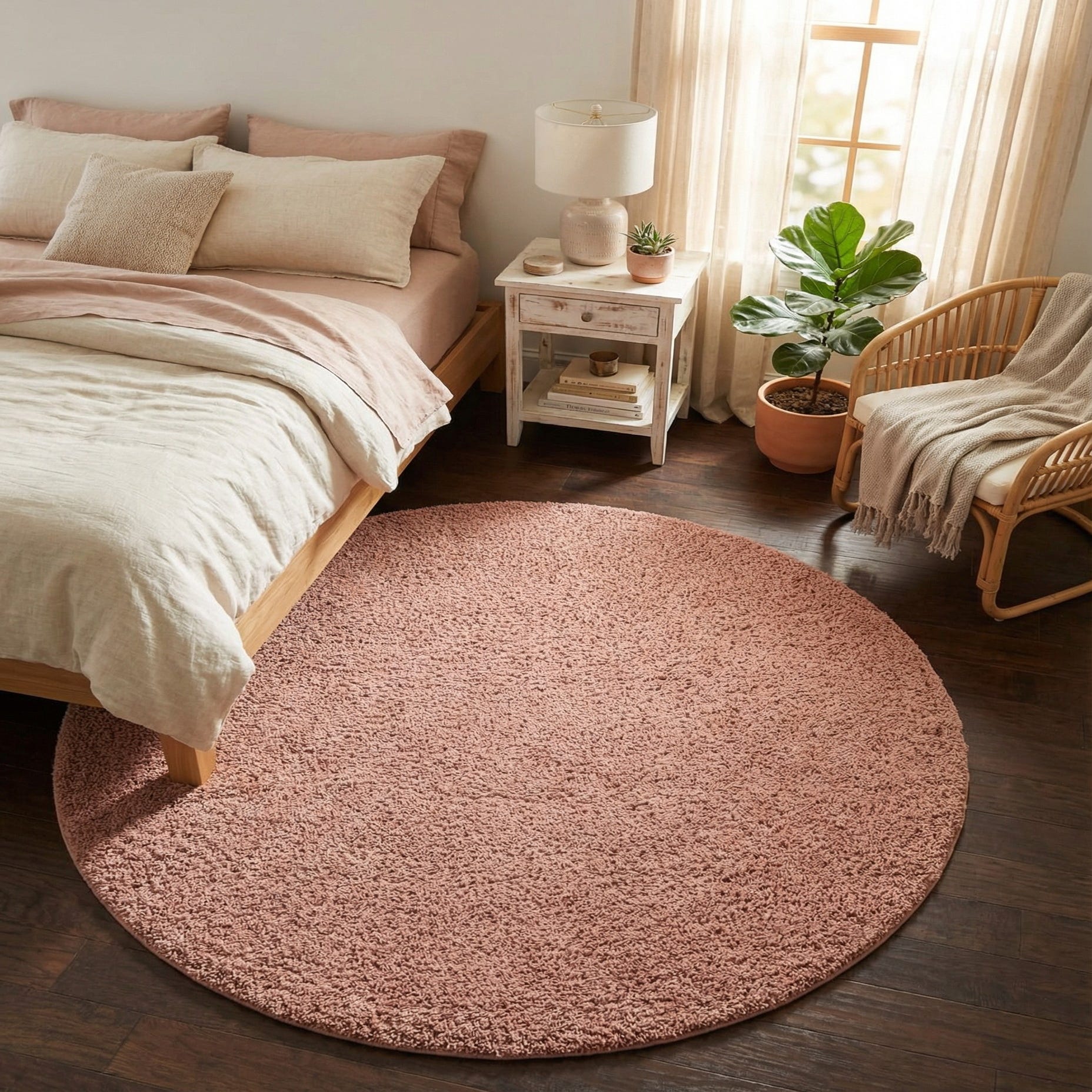 This rug works well wherever you want a cozy, tactile anchor — beside a bed, in a nursery or reading nook, or layered under a small round coffee table to soften a seating area. Pair it with natural wood furniture and soft neutrals for a Scandinavian-inspired scheme, add brass or matte-black accents for a modern touch, or use it to introduce a warm, feminine tone to transitional and eclectic interiors.