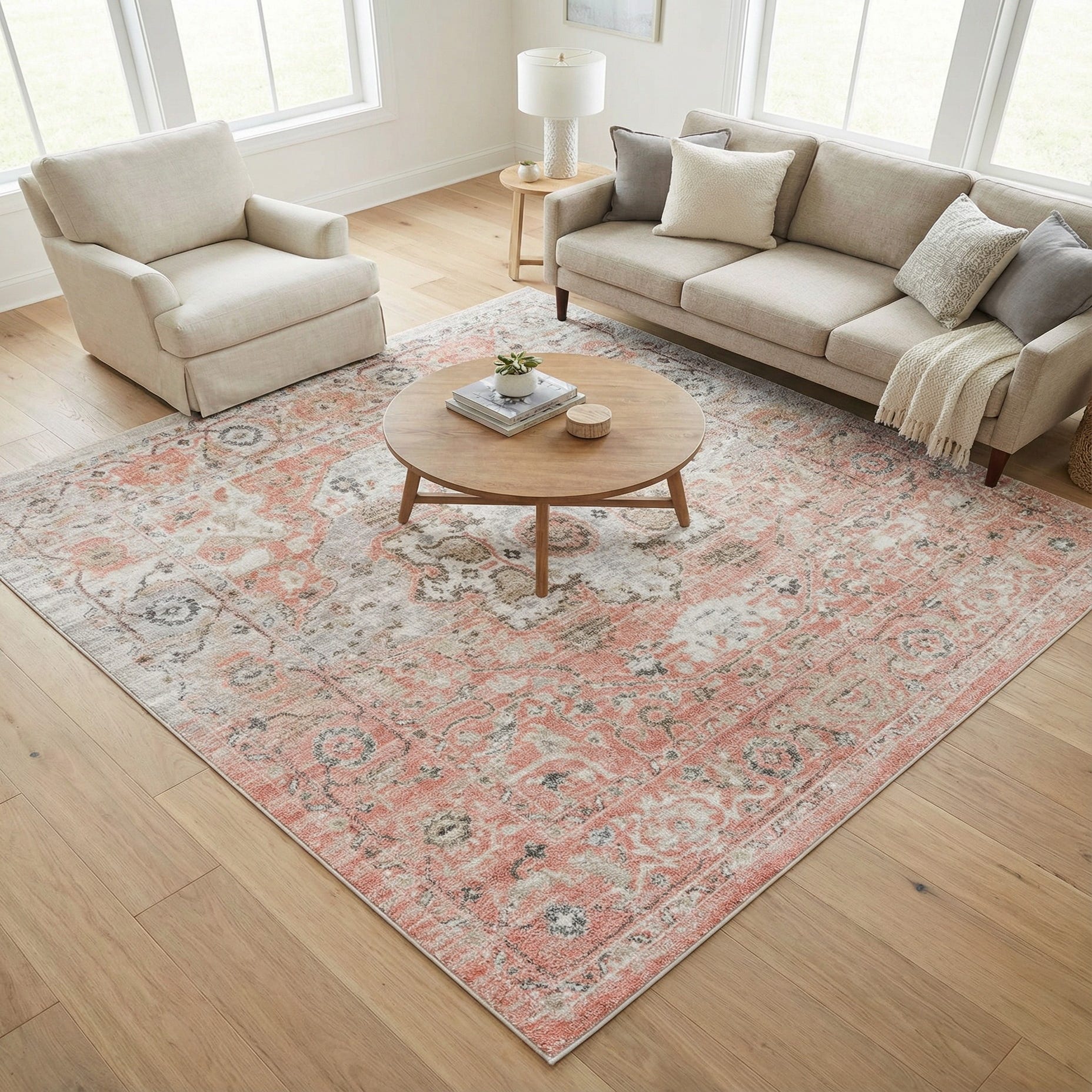 A softly faded medallion and floral pattern gives this rug a vintage-inspired look, with an overall rose pink background that warms the design. Ivory highlights bring the central medallion and scrolling motifs into focus, while gray accents define the finer details and border. The machine-made construction in 100% polypropylene creates a low, even pile with a subtle sheen and a gently textured surface you can feel beneath your hand.