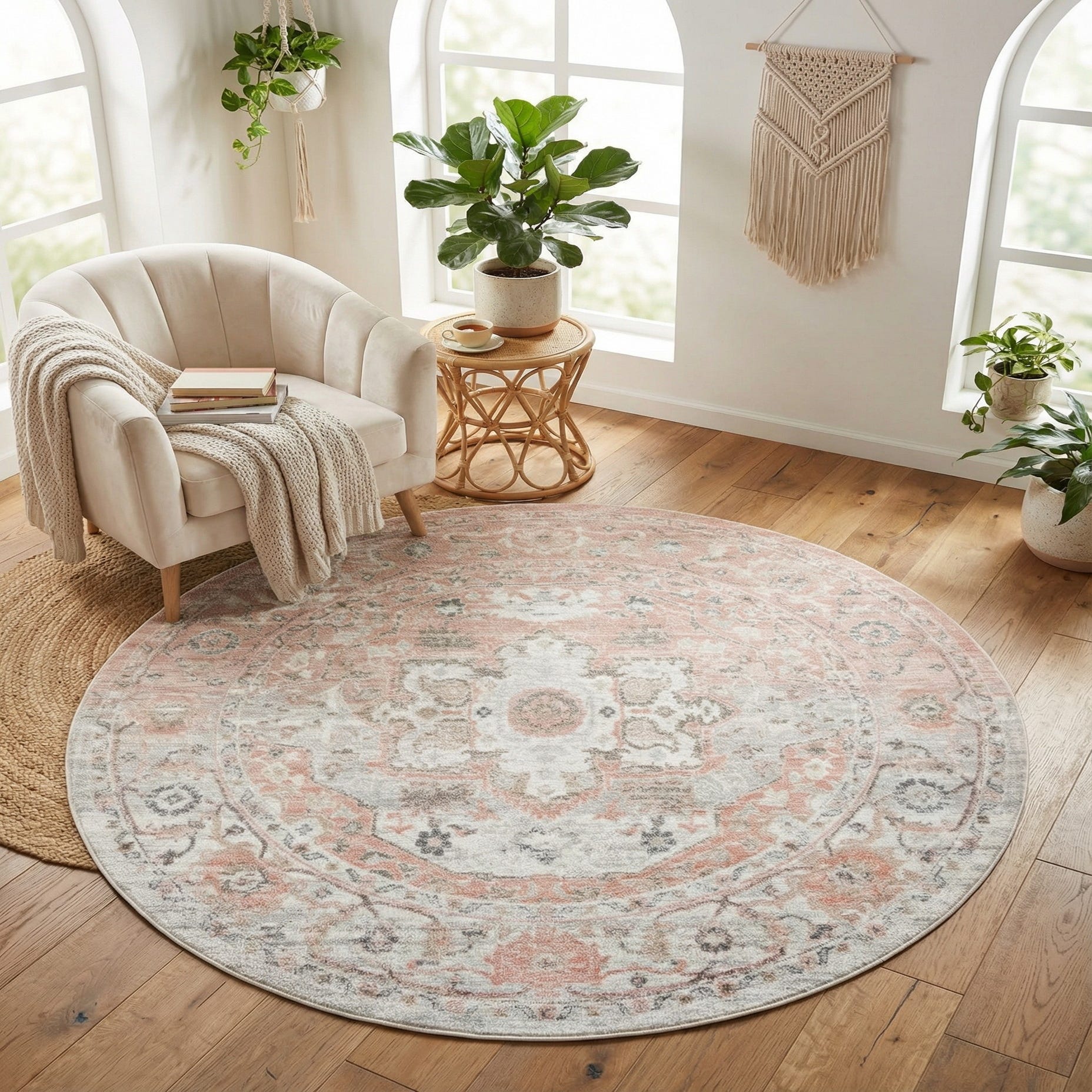 A soft, vintage-inspired medallion takes center stage on a round rug with a rose pink background. Intricate floral and scroll motifs in gray and ivory are arranged in a faded, low-contrast pattern that evokes an antique aesthetic without heavy texture. Machine-made of 100% polypropylene, the rug has a low, smooth pile that feels pleasant underfoot while keeping the pattern clear and defined.