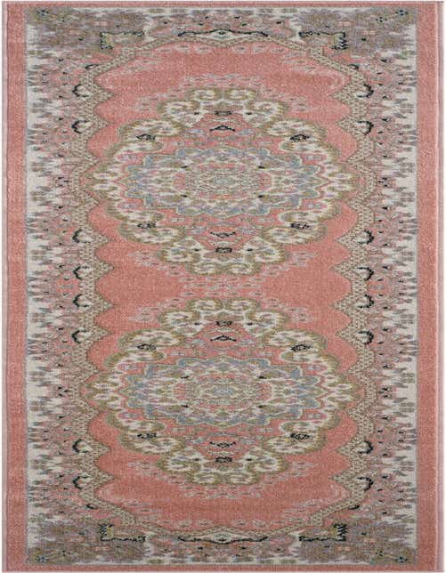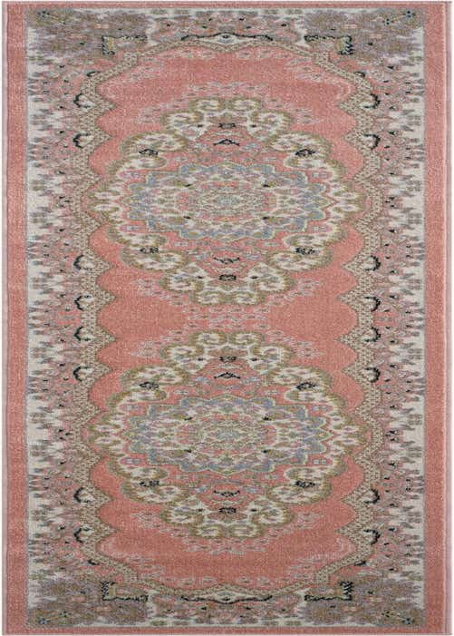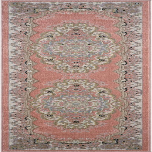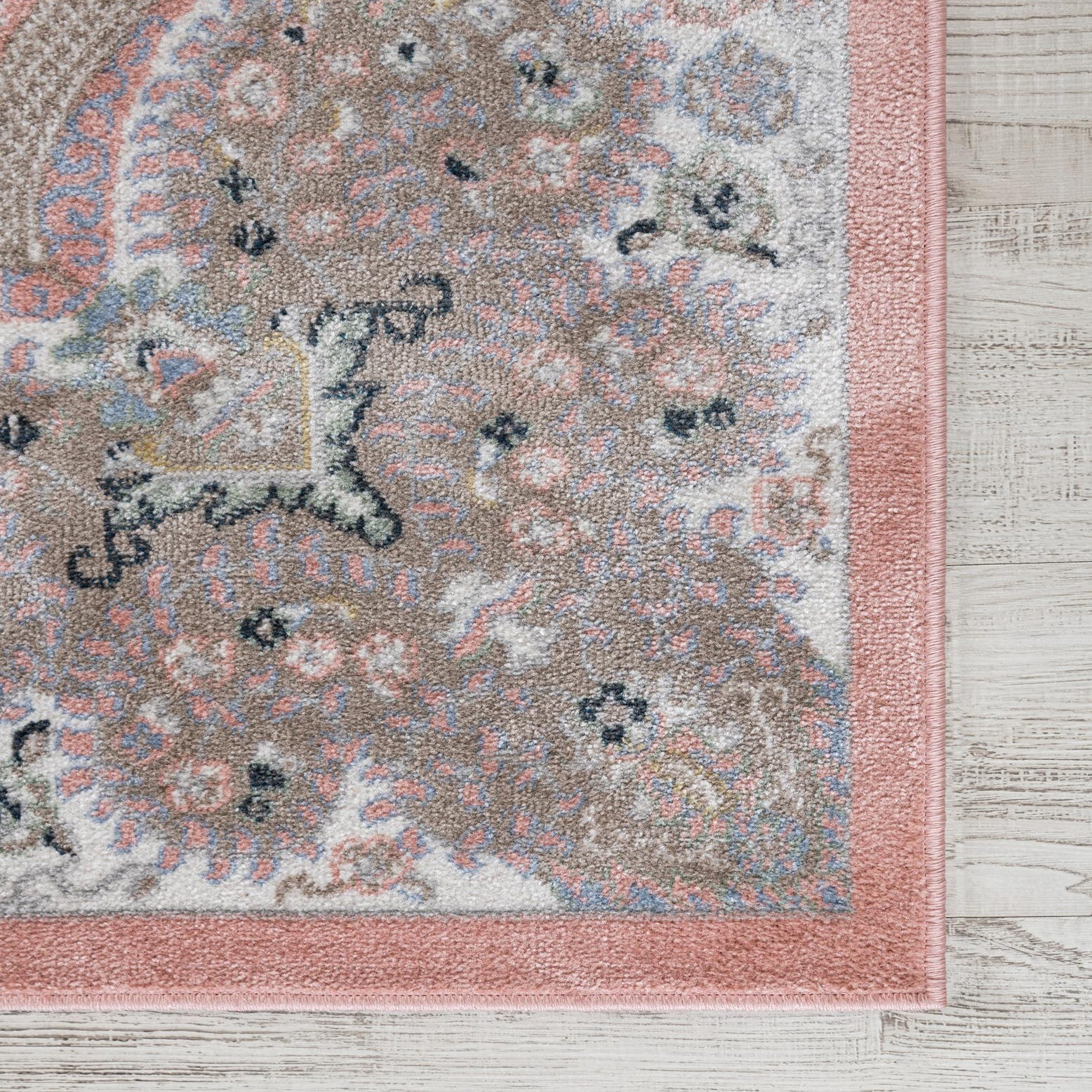 Primary color is Rose Pink. Colors in this rug include: Rose Pink, Beige, Ivory, Light Blue.