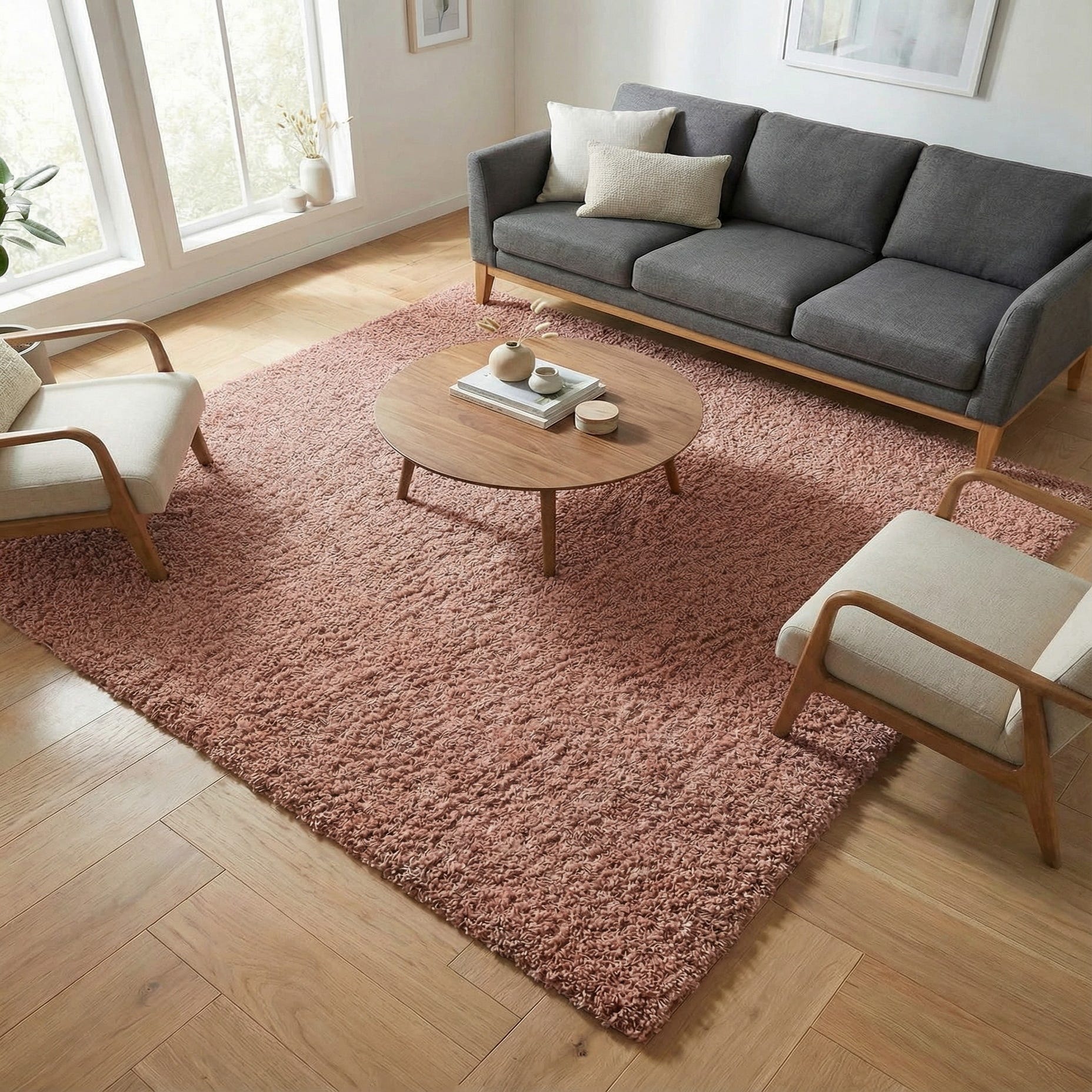 This Everyday Shag rose pink rug could effortlessly elevate a living room, den, or bedroom with its inviting color and luxuriant feel, enhancing the ambiance with its simple yet sophisticated appeal.