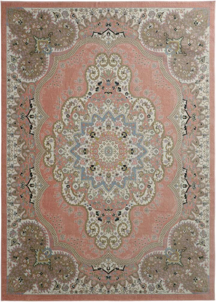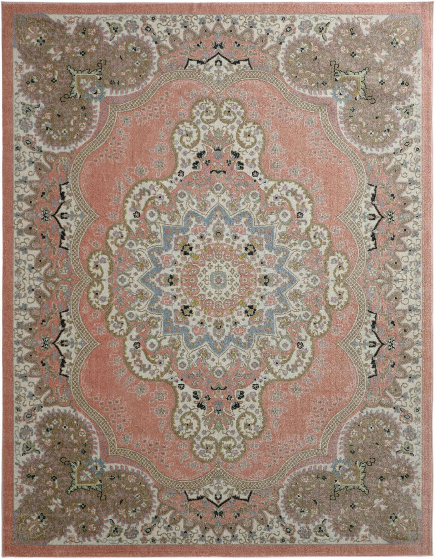Primary color is Rose Pink. Colors in this rug include: Rose Pink, Beige, Ivory, Light Blue.