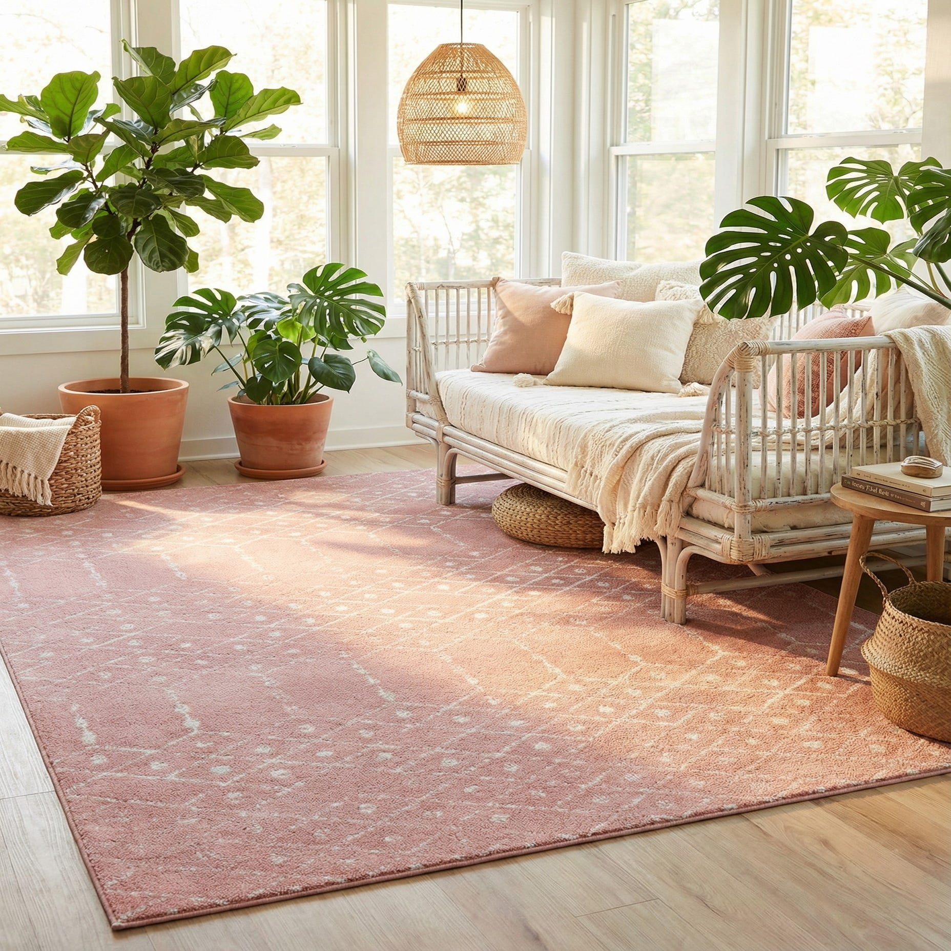 A soft rose pink field is overlaid with an ivory trellis pattern of elongated hexagons and dotted accents, creating a modern, slightly faded geometric look with subtle visual texture. Machine-made from 100% polypropylene, the rug has a low, dense pile that feels cushioned underfoot and offers a smooth, even surface with a gentle sheen where the ivory highlights catch the light.