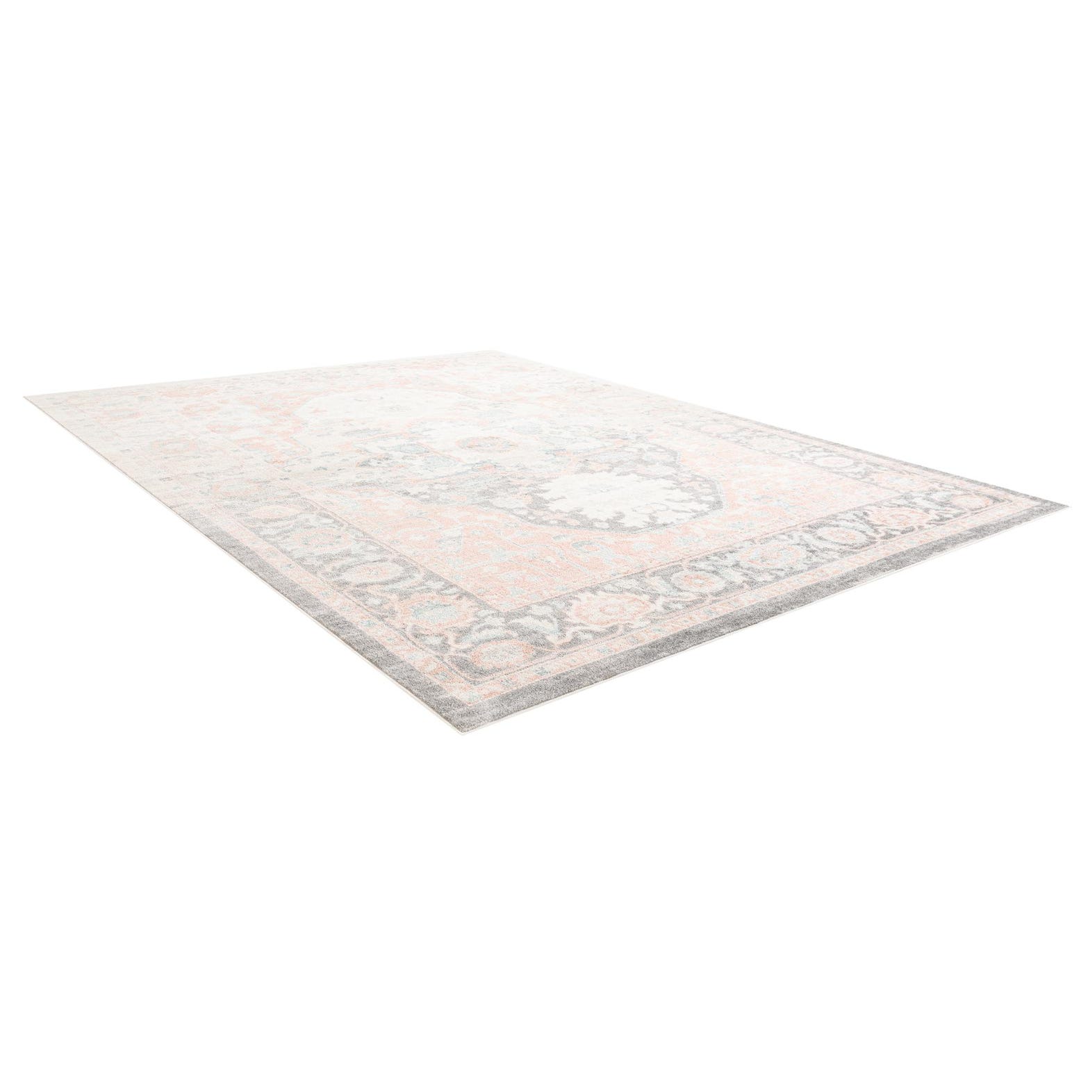 A rectangular 9x12 Madeline Vintage rug featuring a distressed traditional pattern in shades of gray, silver, and pink.