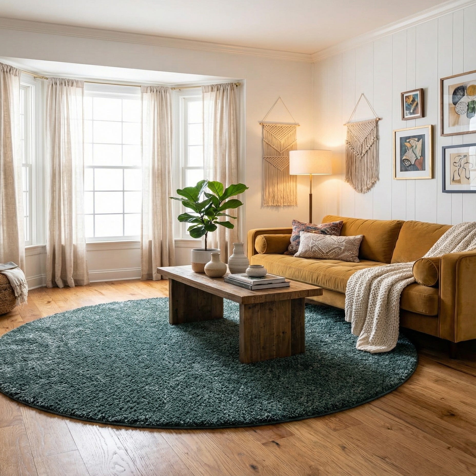 This rug works well wherever you want a soft, grounded focal point — try it beneath a round dining table, at the foot of the bed, or centered in a cozy seating nook. It pairs naturally with warm wood tones, leather or brass accents, and clean-lined contemporary or Scandinavian furnishings, and can also soften a modern living room or casual coastal-inspired space.