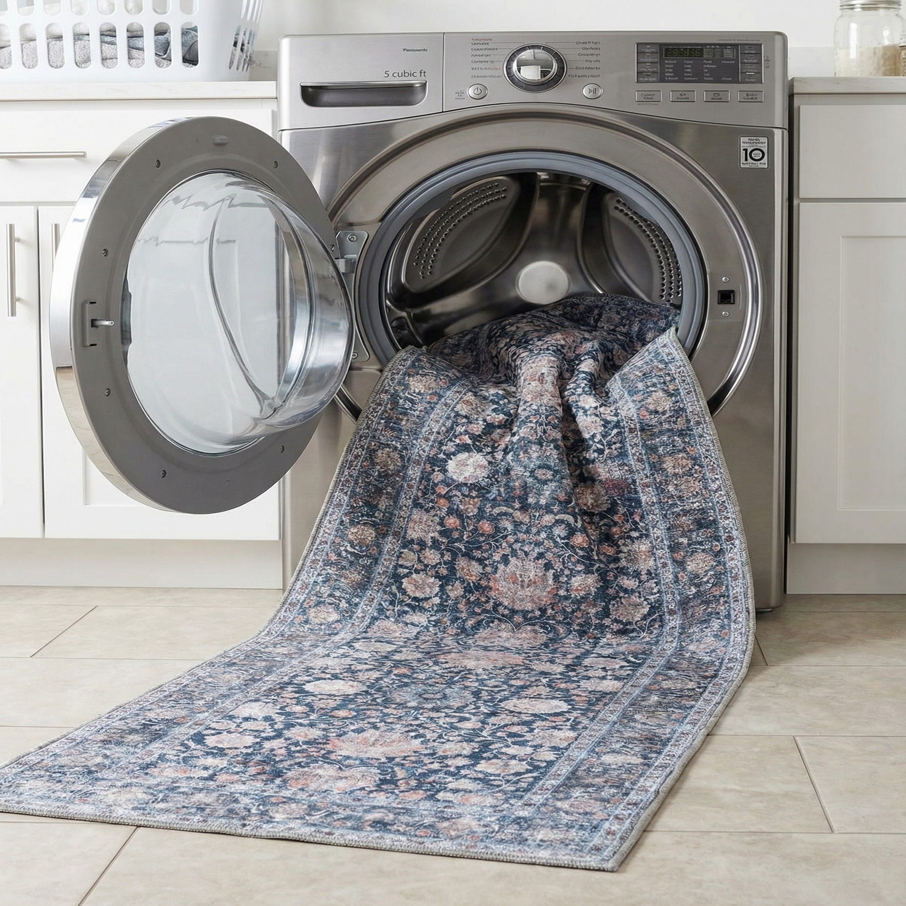 A 10 ft runner rug in royal navy blue with a faded traditional floral pattern and a distressed look, perfect for a hallway.