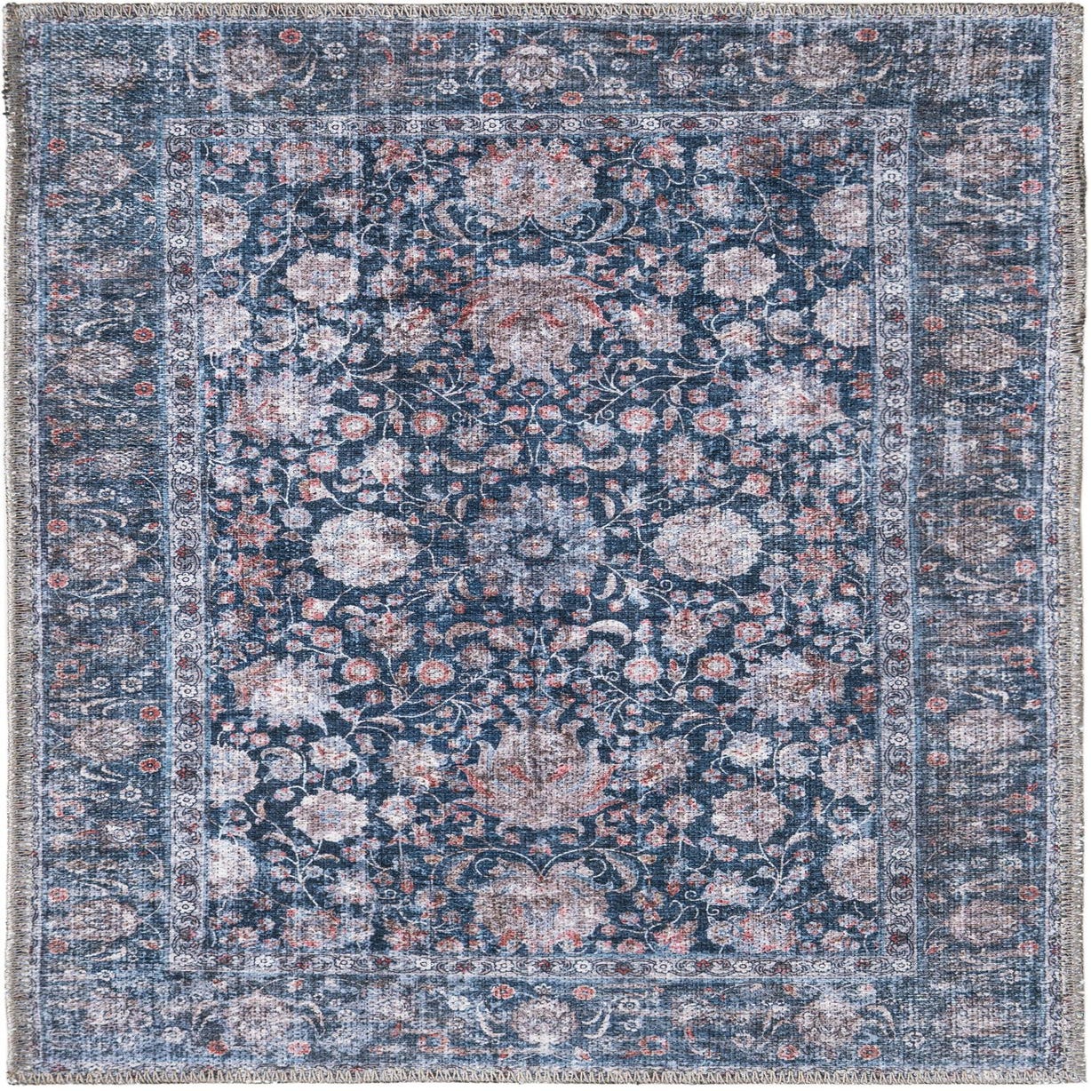 A classic Persian-inspired floral medallion and vine pattern rests on a Royal Navy Blue ground, where gray, ivory, light blue, and rust red highlights trace ornate blossoms and scrolling foliage. A narrow decorative border frames the all-over field, and a softly distressed finish gives the design a gently lived-in look. Machine made of polyester and chenille, the surface pairs chenille’s velvety touch with the durable, tightly woven polyester base, producing a low-profile pile with subtle sheen and a smooth, comfortable hand underfoot.