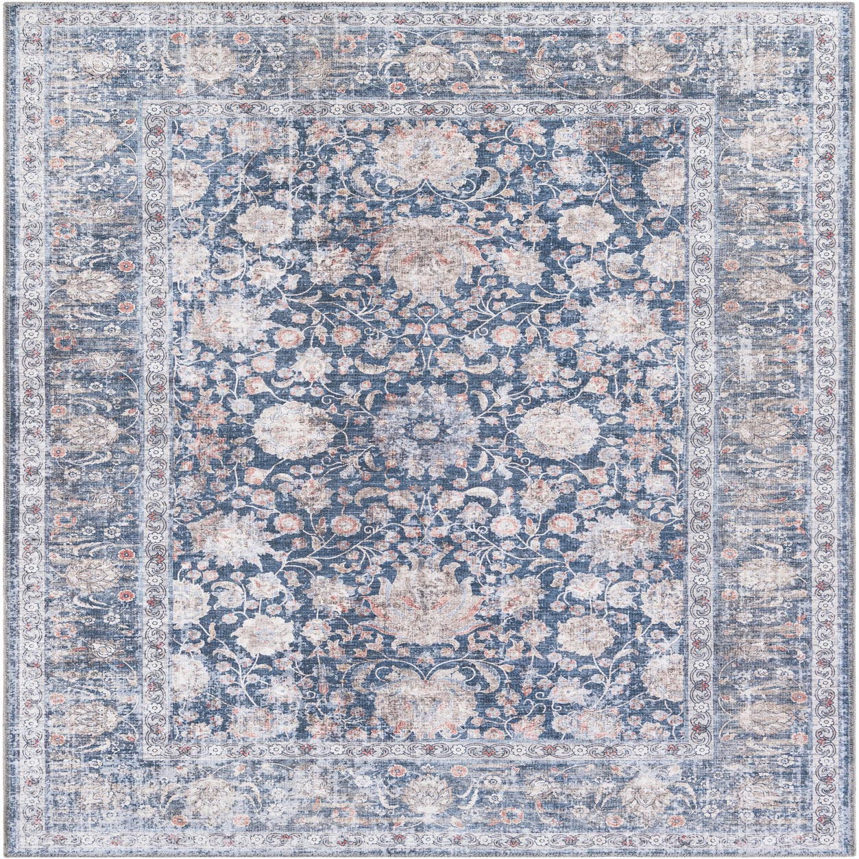 A classic Persian-inspired medallion and floral pattern rests on a royal navy blue background, with scrolling vines and clustered blossoms laid out in a softly distressed finish. Ivory and light blue highlights lift the design while gray tones add depth, and touches of rust red introduce a warm, antique accent. The bordered field gives the rug a defined edge without feeling rigid, and the overall look leans toward a vintage, timeworn aesthetic that pairs traditional motifs with a relaxed, modern sensibility.