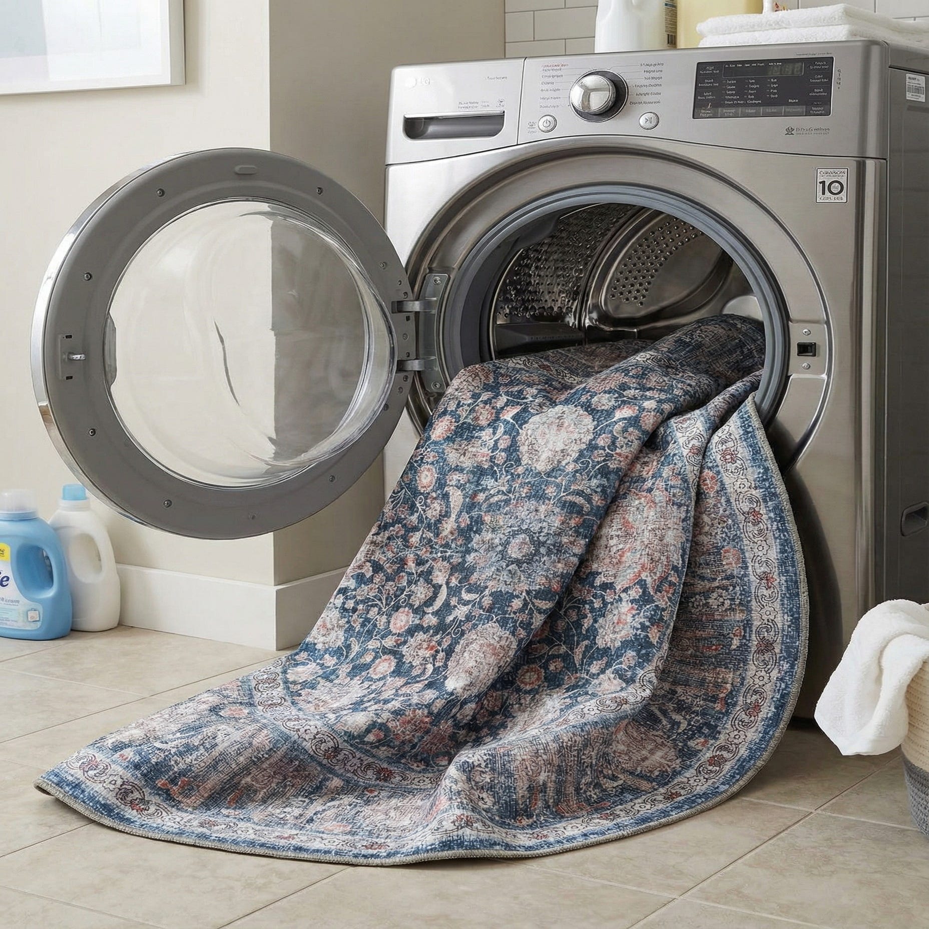 This rug works well beneath a round dining table or as the focal point of a cozy conversation area, and it complements both traditional and transitional interiors. Pair it with warm wood furniture and brass or antique metal accents for a composed, layered look, or use it to add depth to a light, coastal-inspired room with linen upholstery and woven accessories. Its color palette and pattern also play nicely with neutral sofas, navy throw pillows, and tapered-leg furniture to create a balanced, inviting space.