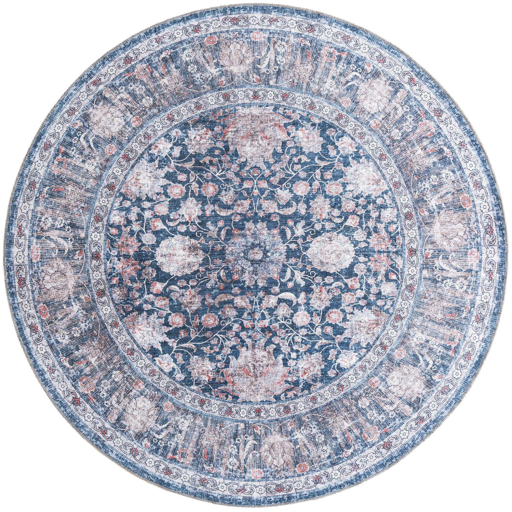 A Persian-inspired medallion and floral motif fills this round rug with layered, vintage character. The Royal Navy Blue background anchors the design while faded coral, soft ivory, and pale blue accents weave through the pattern, giving it a gently aged, well-loved appearance. Machine-made from a polyester and chenille blend, the surface offers a soft, slightly brushed hand—chenille brings a plush, velvety feel underfoot while polyester contributes a subtle sheen and consistent texture across the pile.