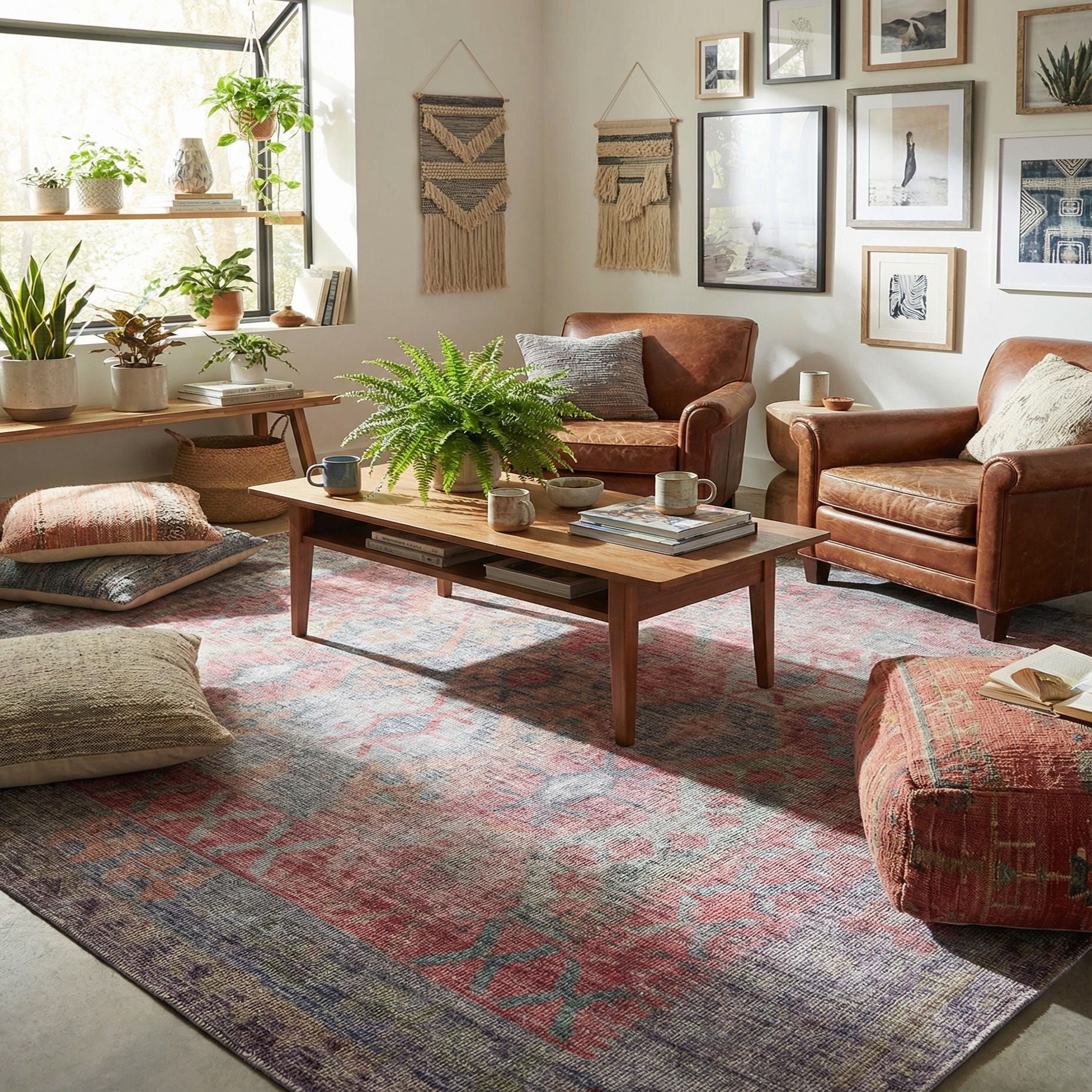 Machine-made of polyester chenille, the surface has a soft, velvety hand and a slightly plush feel underfoot, with faint color variation where the yarns catch the light. Well-suited to a relaxed living room seating area or centered beneath a square dining table, it pairs easily with warm woods, leather seating or linen upholstery. Use it in a transitional or bohemian-inspired space to add layered color, or place it in a bedroom to anchor a seating nook and bring a quiet, lived-in warmth to the floor.