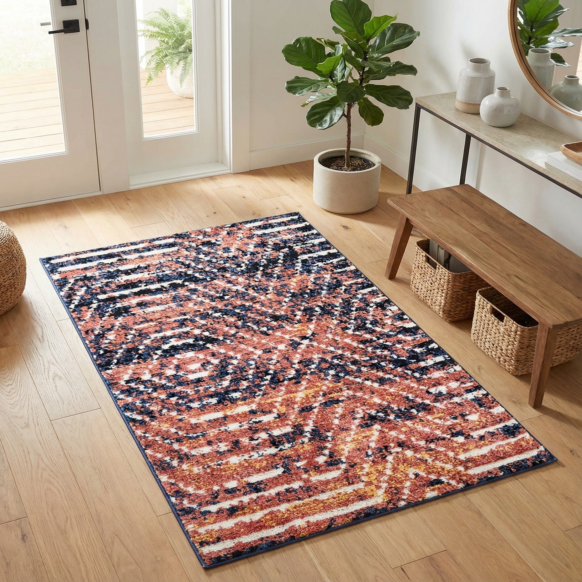 The Tagine Collection offers a 3x5 rug with a dynamic and contemporary pattern that brings warmth and vibrancy to any living space. Machine woven of 100% polyester, this rug is both stain-resistant and shed-free, promoting durability and ease of maintenance. The vibrant rust orange background sets a rich foundation for the intricate overlay of navy blue, black, and ivory patterns. The juxtaposition of these colors produces a visually striking effect, with a texture that adds depth and interest.