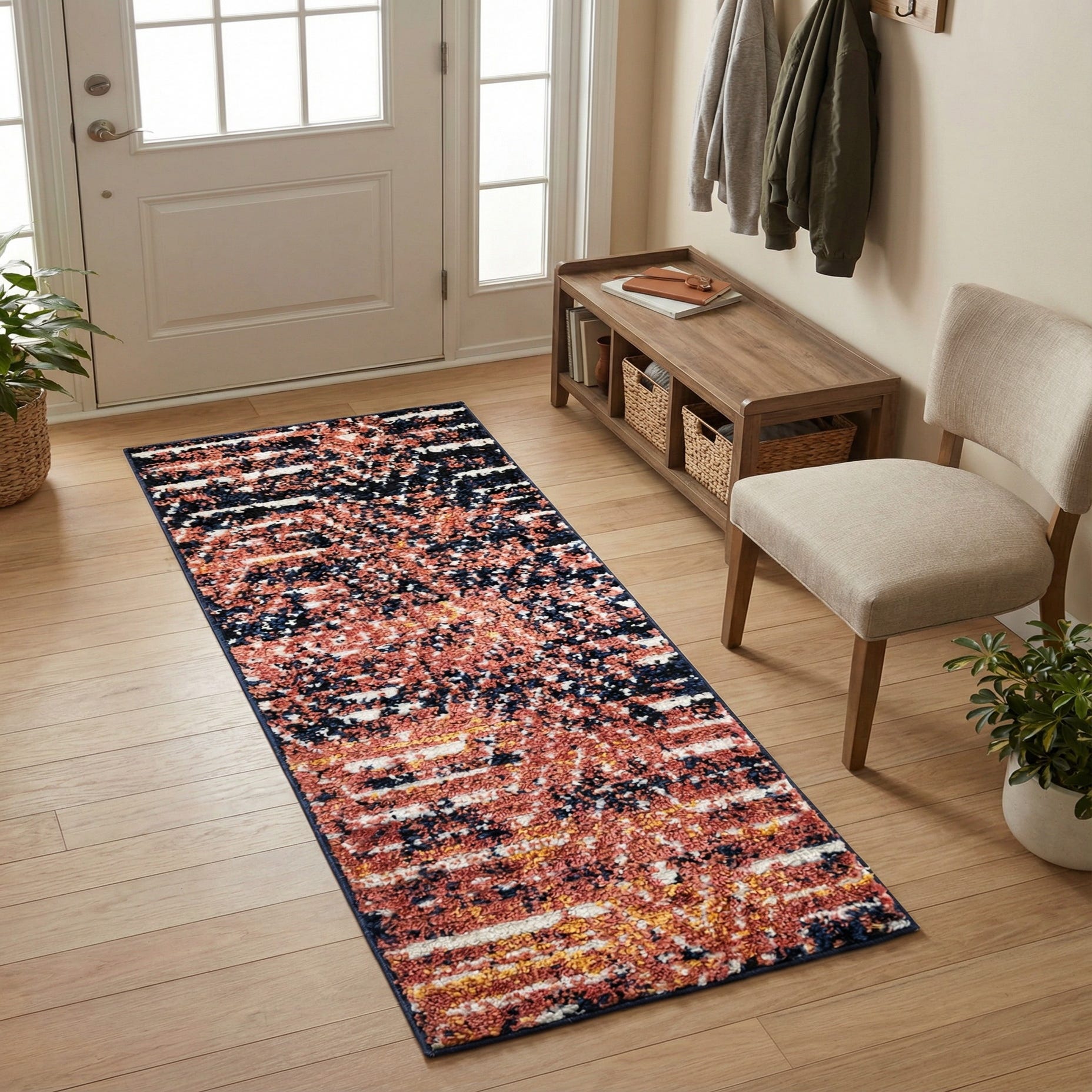 This runner brings color and movement to narrow spaces — place it in an entry, hallway, kitchen aisle, or alongside a bed to anchor the room. It pairs naturally with warm wood finishes, navy or ivory upholstery, and black metal accents, and works well in contemporary, mid-century modern, or eclectic interiors that welcome bold color and tactile detail.