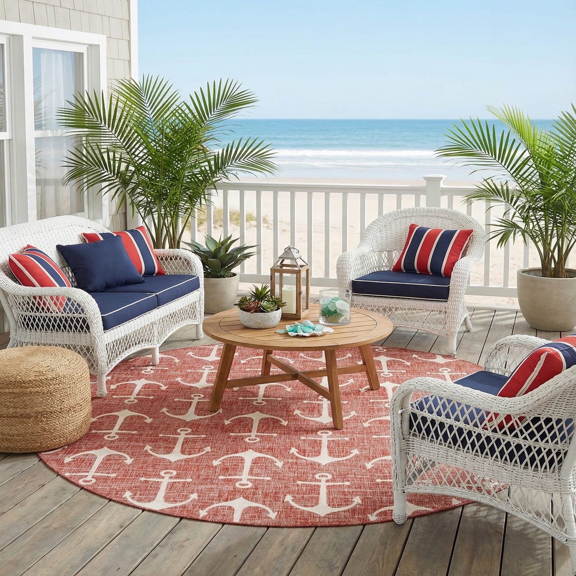 The stain-resistant nature of this rug, paired with its pet-friendly and shed-free characteristics, makes it an ideal addition to spaces where practicality is as important as style. This rug's maritime theme can brilliantly complement coastal, nautical, or beach-inspired decor, seamlessly integrating with light woods, natural textures, and a palette that echoes the sea and sand. Given its round shape, it can serve as a focal point in a conversation area, under a circular dining table, or in an outdoor lounge space to create a cohesive and inviting atmosphere.