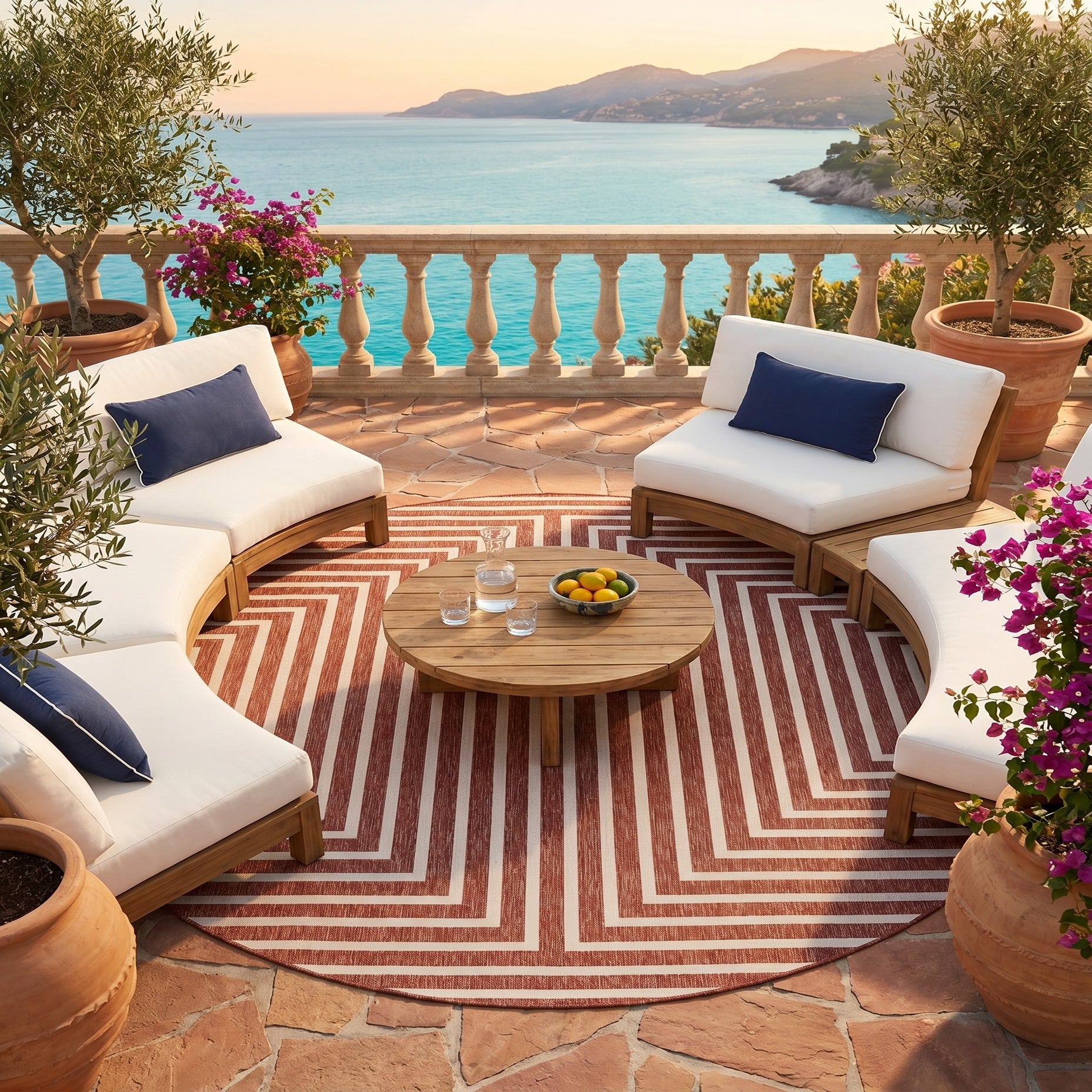 Love the contemporary look of this rug! We are so happy we chose this to accent the blue of our pool with our living area on our lanai. We still are going to add a few more pillows but love the rug to add color.