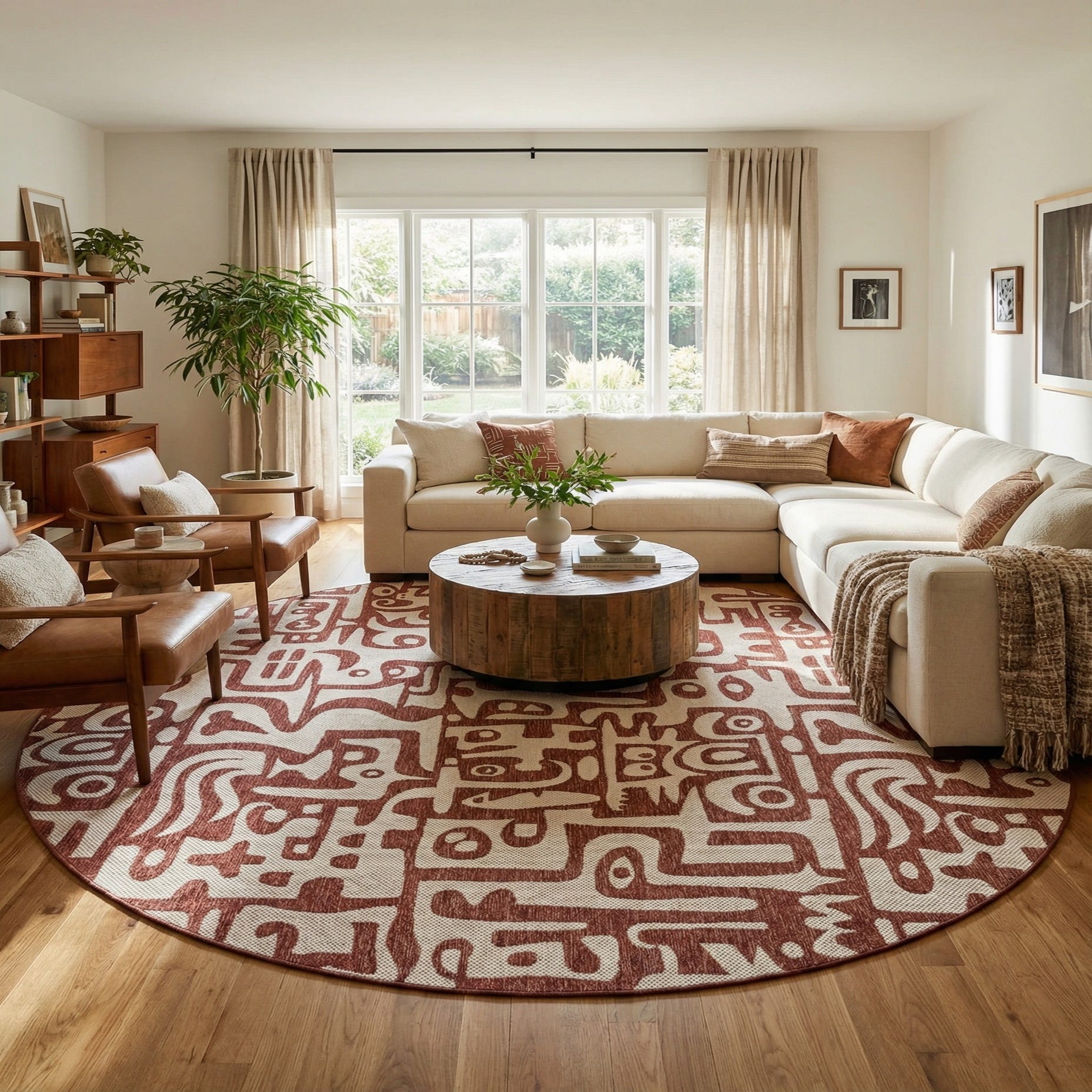 A bold rust red ground anchors this round rug, while a network of ivory, glyph-like shapes and flowing linear motifs creates a lively, modern pattern. The design balances geometric and organic forms for a contemporary, graphic look that draws the eye without overwhelming a space. Machine made from 100% polypropylene, the rug has a low-profile, tightly woven surface with a slightly textured hand that feels firm underfoot and keeps the pattern crisp.
