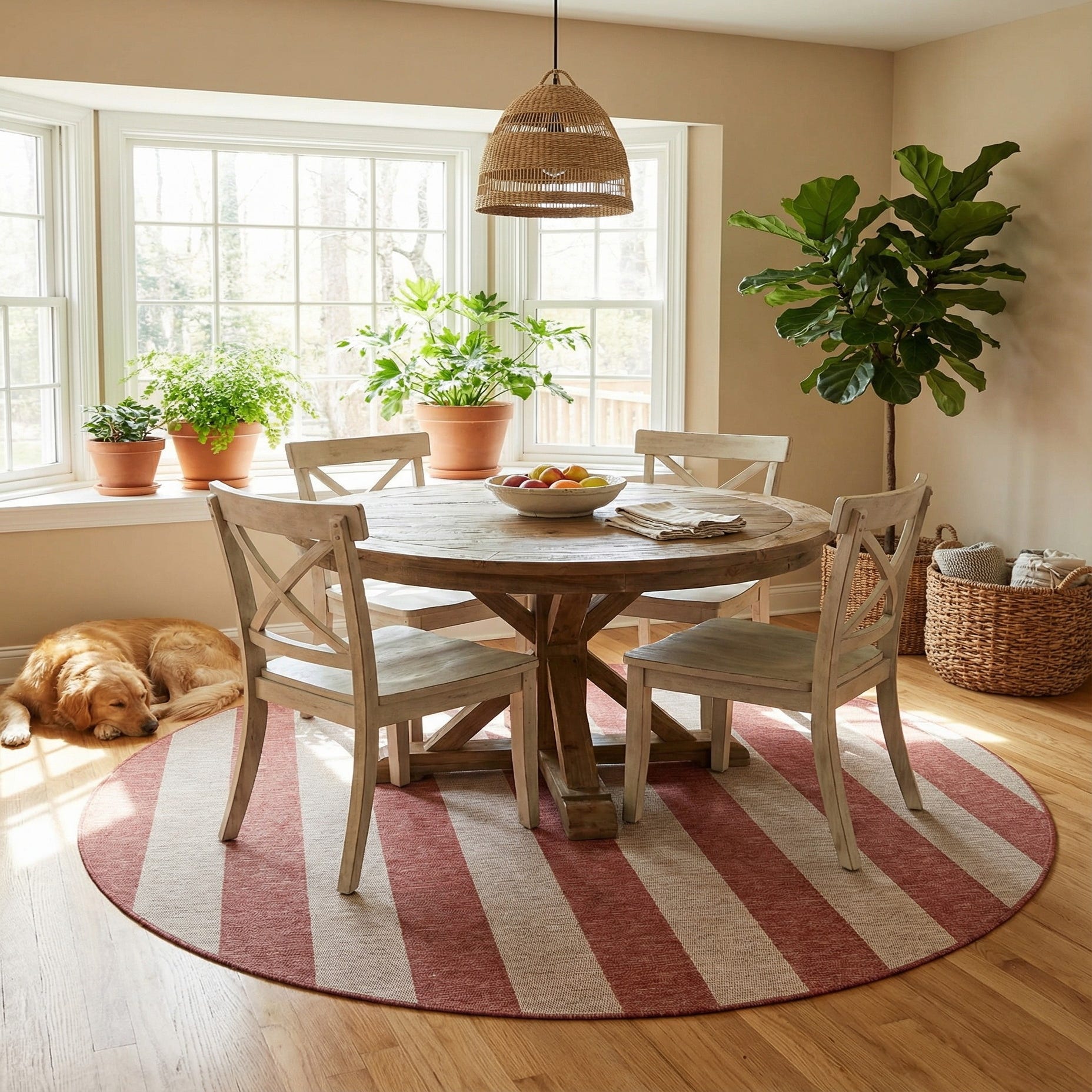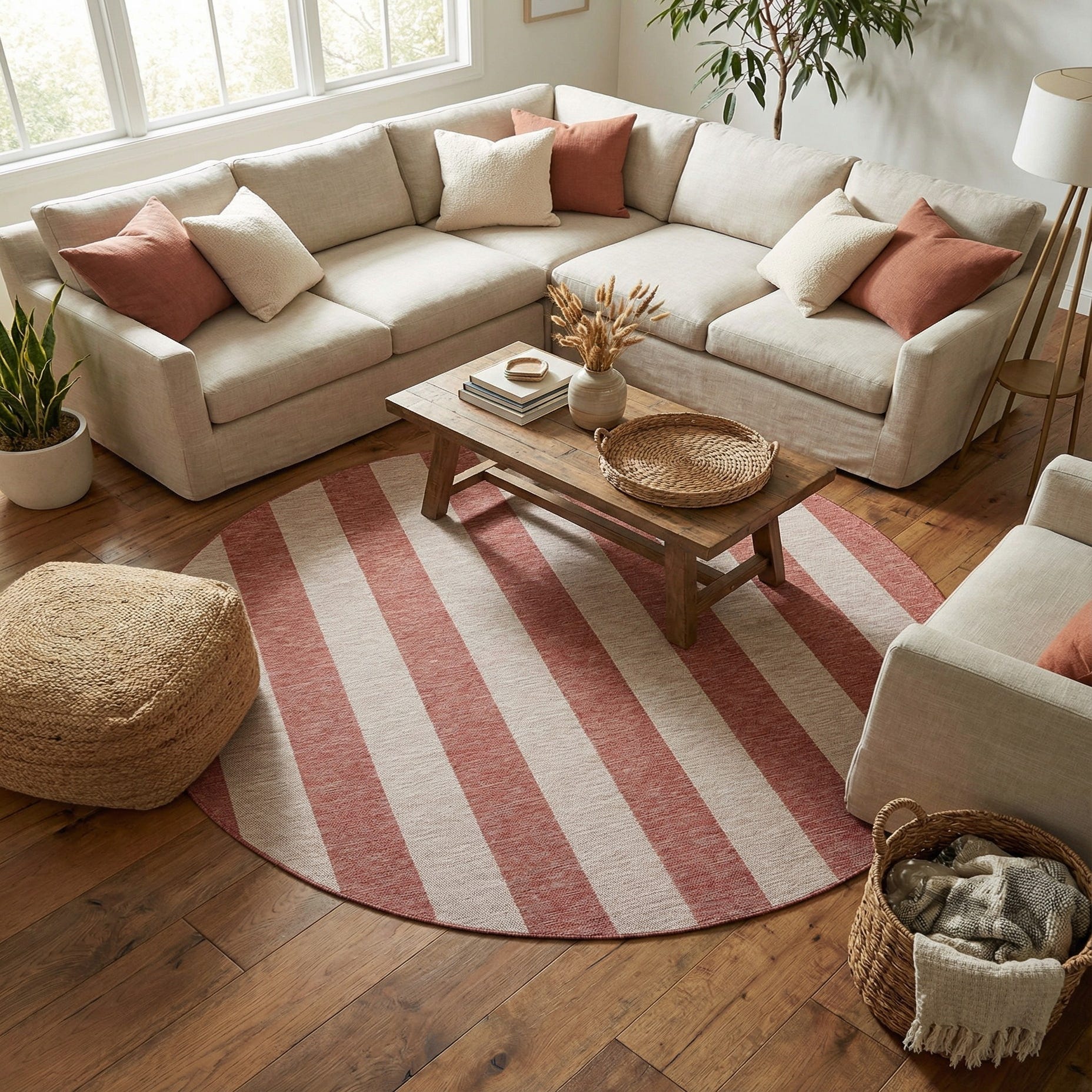 This round design works well on a covered patio or sunroom as a defined seating area, under a circular dining table, or layered on a larger neutral floor for visual interest. Pair it with warm wood tones, woven outdoor seating, or linen upholstery; it also complements coastal, modern farmhouse, and contemporary outdoor living schemes.
