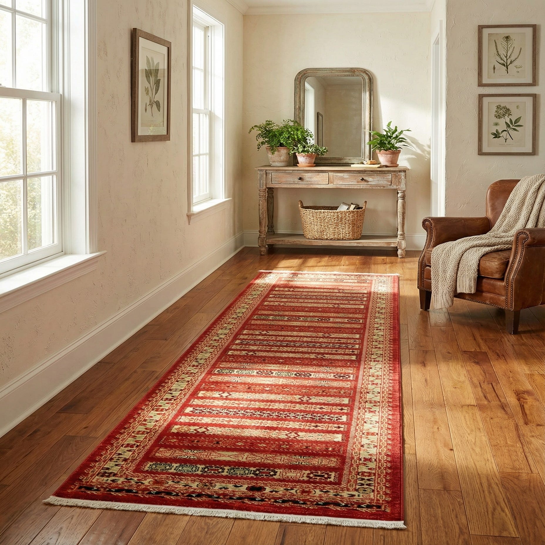 Machine-made from 100% polypropylene, the low-profile pile feels smooth underfoot with a gentle, supportive hand and well-defined motif edges. This runner works well in hallways, entryways, a galley kitchen, or alongside a bed, and pairs naturally with warm wood floors, leather or neutral upholstery, and mixed-metal accents. Use it to add a focused band of color in a narrow space, or layer it under simple furniture to bring pattern and warmth into traditional, transitional, or globally inspired interiors.