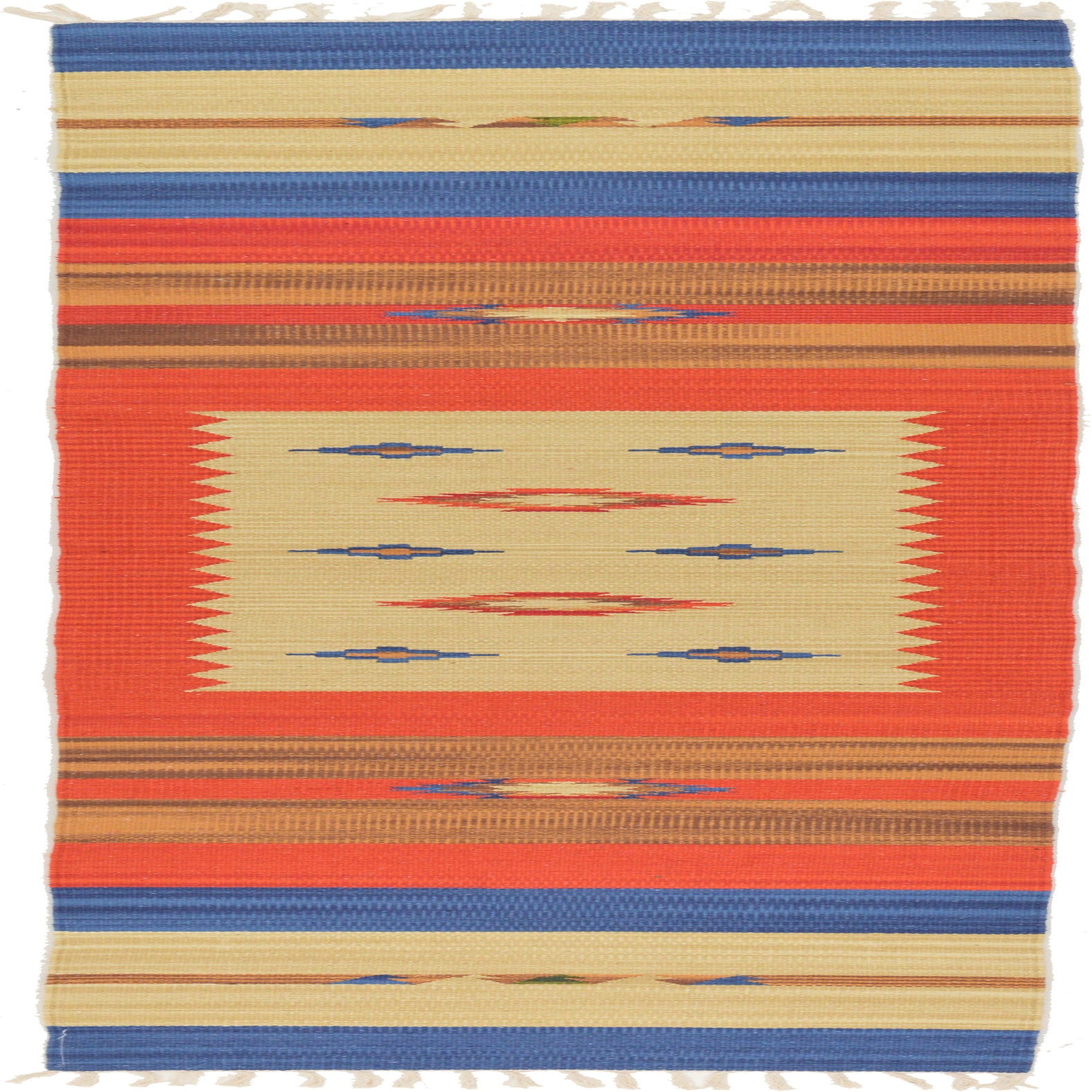 Primary color is Rust Red. Colors in this rug include: Rust Red, Brown, Cream, Light Blue, Light Green, Navy Blue.