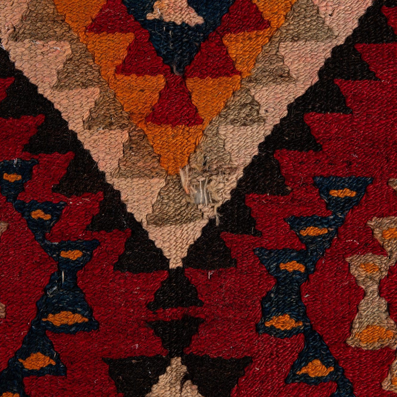 A 10 Ft Kilim Fars runner rug with a vibrant red background and a central column of large, colorful geometric diamonds in oranges, blues, and creams, flanked by striped borders.