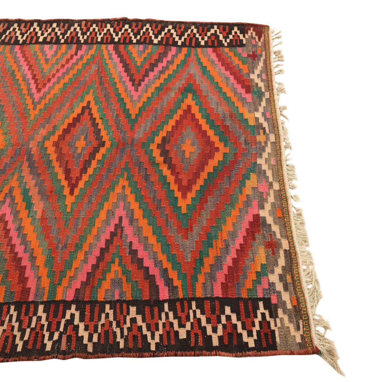The Kilim Fars Collection presents a 10 ft runner, meticulously hand-woven of 100% wool, embracing both heritage and durability. This semi-antique rug, aged between 40 to 60 years, displays a dynamic, geometric pattern that is rich in cultural history. The primary field is a deep rust red, creating a warm backdrop for the intricate series of diamond motifs that traverse its length. Accented with hues of brown, green, ivory, orange, and pink, this rug offers a vibrant palette that remains pleasing to the eye and can invigorate any living space.