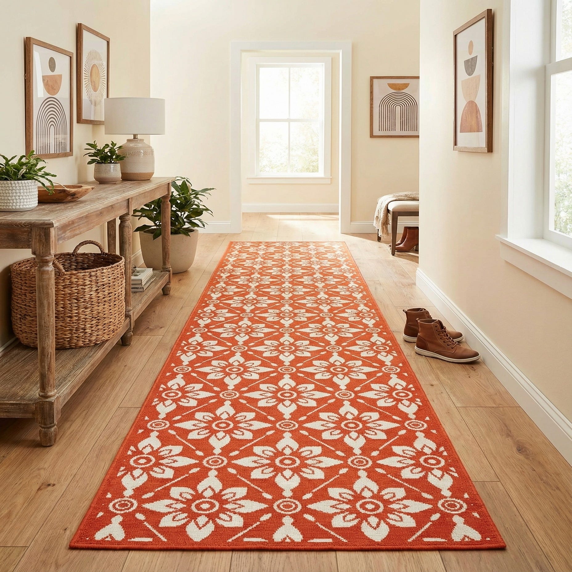 A 10 ft runner rug featuring a repeating modern floral pattern in vibrant orange and off-white, suitable for a hallway or patio.