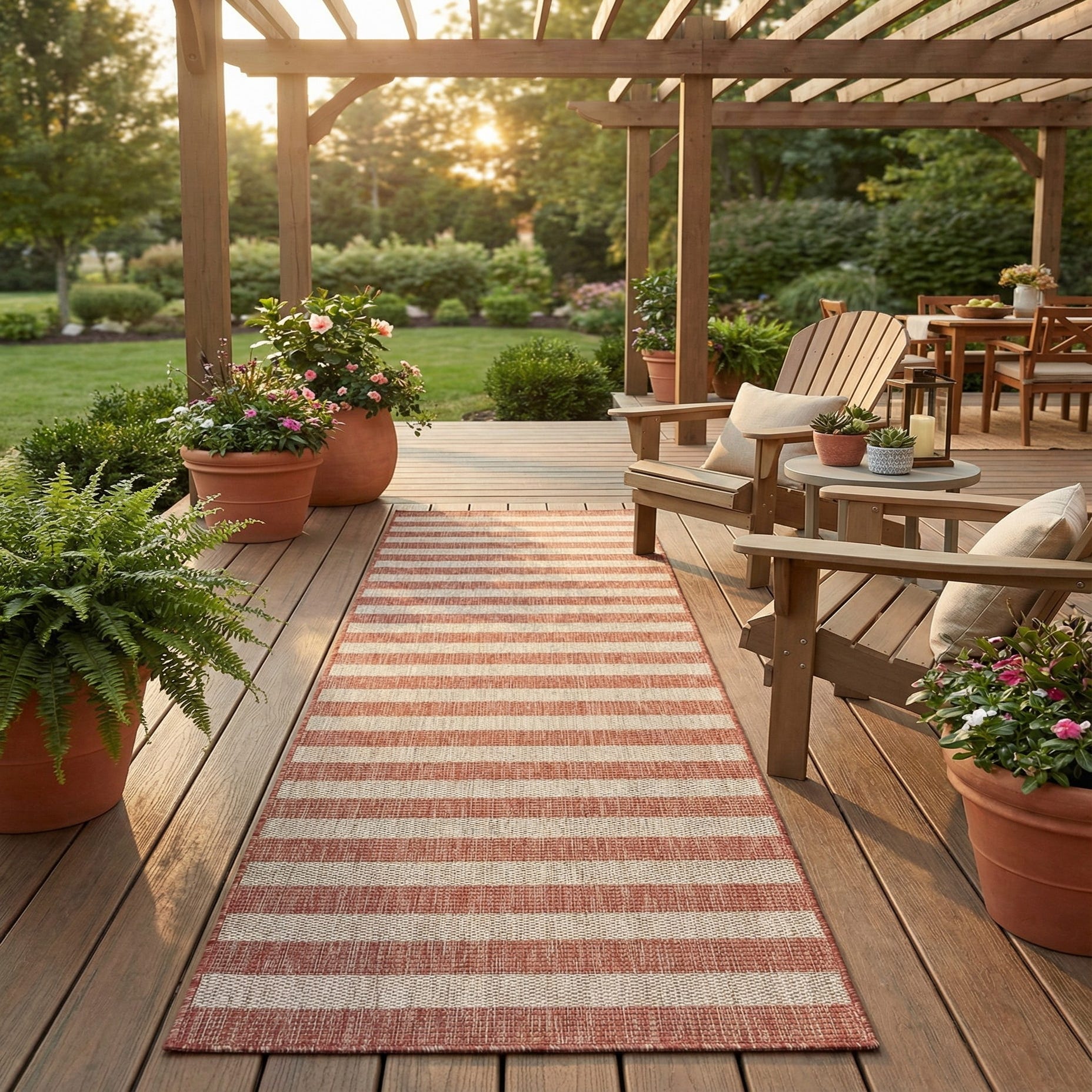 Rust-red ground bands run the length of this runner, punctuated by evenly spaced gray ribbons that create a clean, horizontal stripe. The pattern is machine-made from 100% polypropylene and woven in a low-profile, flat construction that you can feel beneath your feet — a subtle ribbed texture where the stripes meet gives the surface a tactile quality without added pile.
