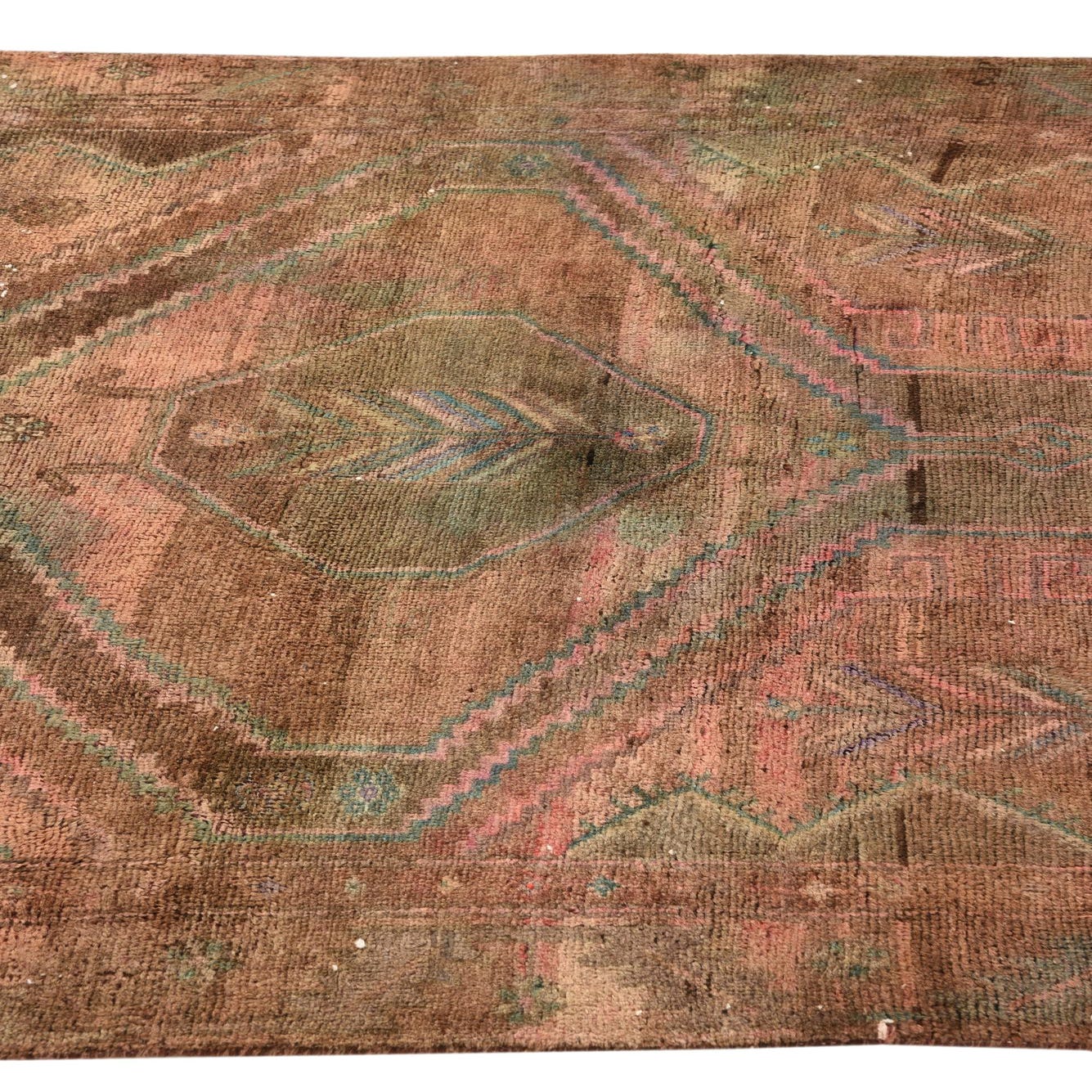 With condition details including low pile spots and repair, this semi-antique rug (40-60 years old) possesses a character-rich patina, evidencing its history and use. It offers a tactile experience marked by a plush texture that only pure wool can provide.