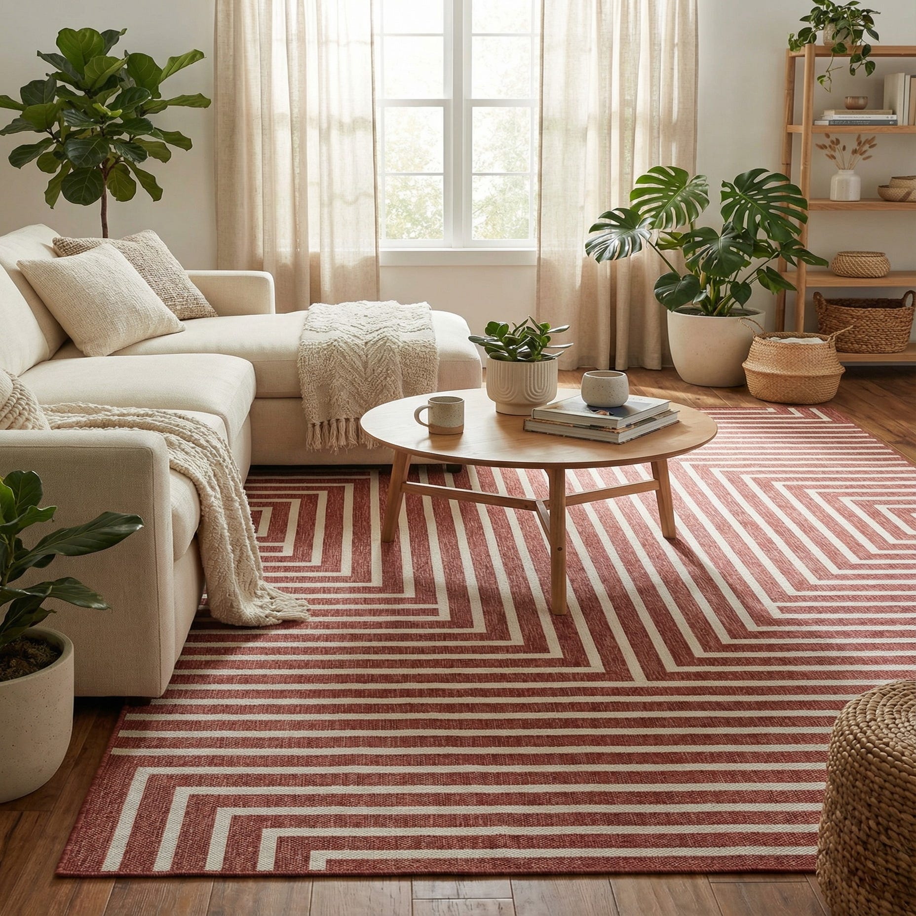 Machine-made of 100% polypropylene, the rug has a low-profile, tightly woven surface with a slight striated texture that feels smooth underfoot. Its durable construction and graphic look make it a natural fit for a covered patio or sunroom, a modern dining area, or an open-plan living space where clean lines and warm tones are desired. Pair it with warm wood furniture, black metal frames, and neutral linens for a contemporary setting, or use terracotta pots and woven accents to emphasize a relaxed, earth-forward palette.