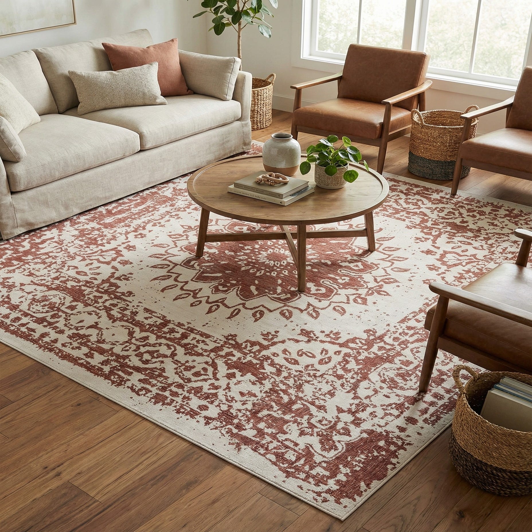 Primary color is Rust Red. Colors in this rug include: Rust Red, Ivory.