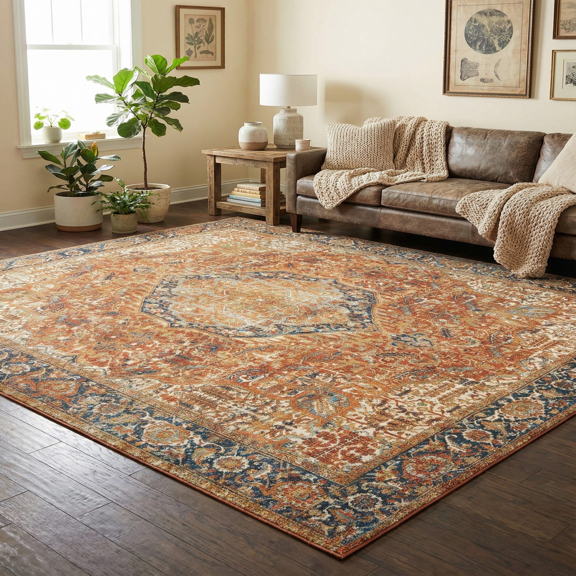A 10x12 rectangular orange and red traditional rug with an ornate floral pattern and a navy blue border, suitable for indoor or outdoor use.