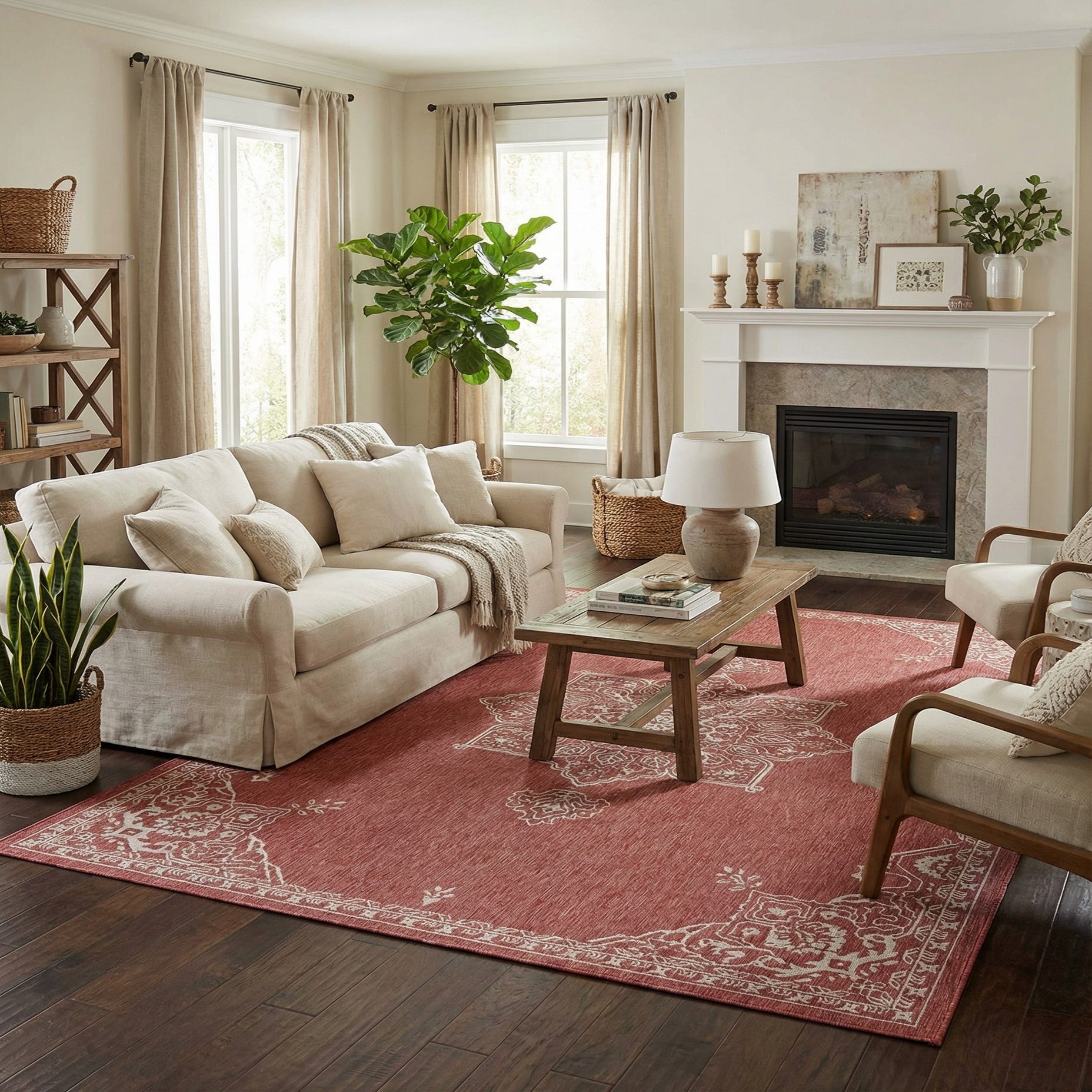 Machine-made of 100% polypropylene, the rug has a low-profile, tightly woven face that lays flat and smooth underfoot and will integrate easily into both indoor and covered-outdoor settings. Use it to anchor a patio dining set or define a relaxed living area on a screened porch; it also works well beneath a casual dining table or in a sunroom. Pair it with weathered woods, painted wicker or iron furniture, and neutral linens for a relaxed traditional look, or combine it with warm leathers and slate-gray accents to bring a layered, lived-in feel to the space.