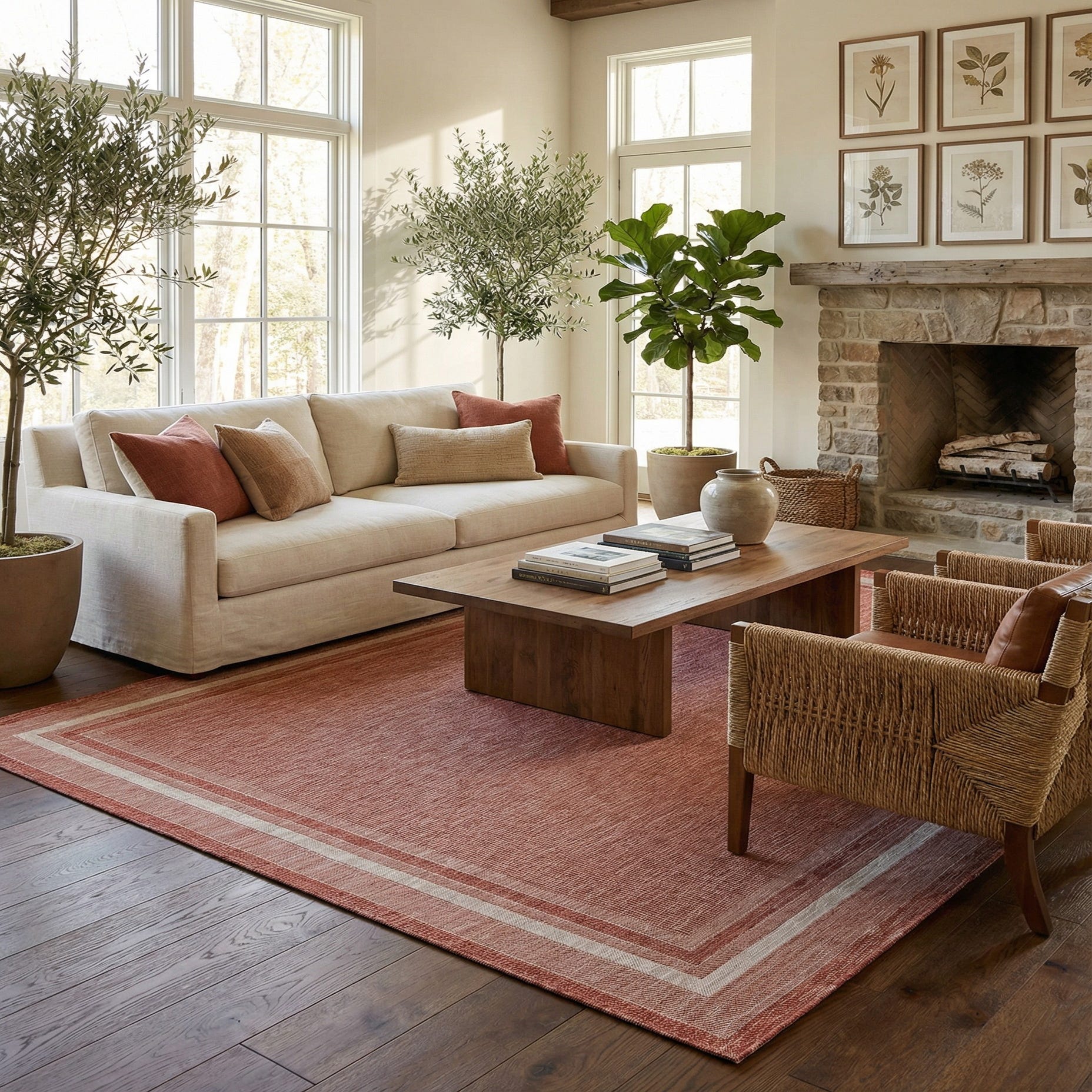 Perfect for anchoring living rooms with neutral furniture or adding a pop of warm color to minimalist decor, this rug is also an excellent choice for outdoor patios or dining areas looking to create an inviting ambiance. This piece can be effortlessly integrated into contemporary, transitional, or even coastal design themes due to its clean aesthetic and resilient fabric.