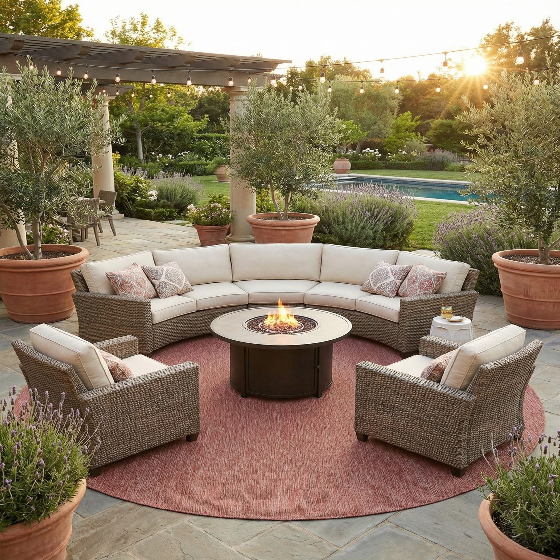 A large 10' 8 round indoor/outdoor rug in a solid terracotta orange-red color with a subtle textured flatweave.