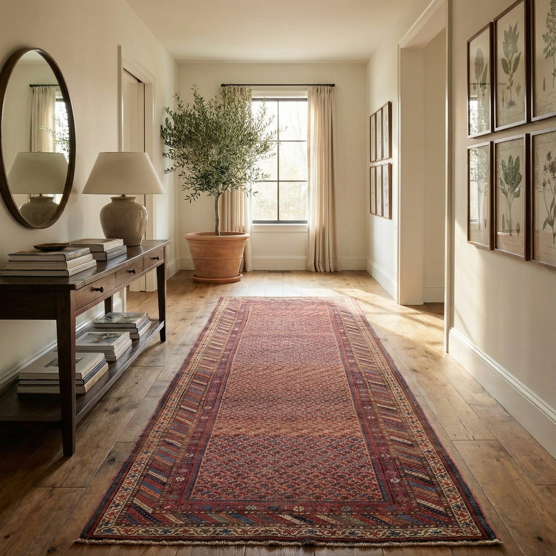 Ideal for enhancing hallways, long and narrow spaces, or as a statement in living areas, this Malayer runner is a versatile piece that complements spaces with traditional decor, adds a contrasting element to modern minimalist settings, or creates a rich, layered look in eclectic interiors. Its robust wool construction and timeless pattern make it a worthy investment for those looking to elevate their home with a touch of history and artistry.
