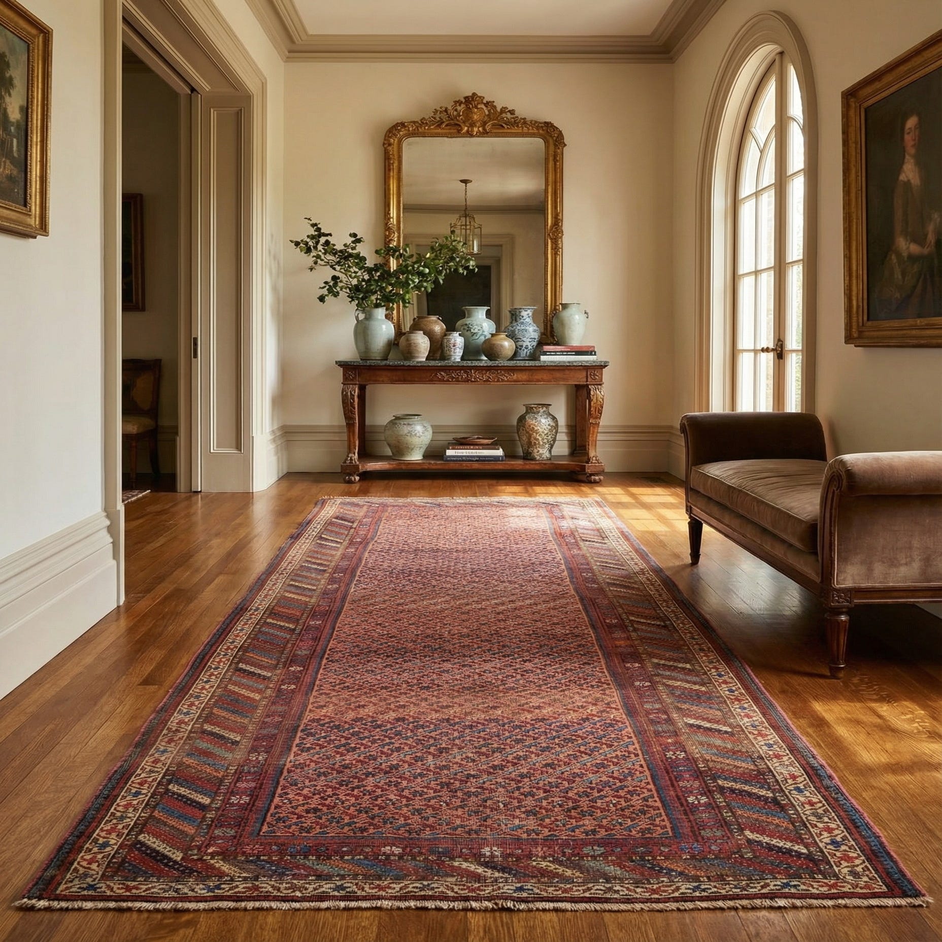 The Malayer Collection presents a hand-knotted 100% wool runner, offering a harmonious integration of color and design for sophisticated interiors. With a background color of rust red, this 11-foot runner rug features complementary hues of beige, blue, brown, and navy blue, forming a traditional pattern that speaks to its rich heritage. The low pile and indications of repair and missing fringe add to the authentic antique charm, grounding spaces with a sense of history and depth.