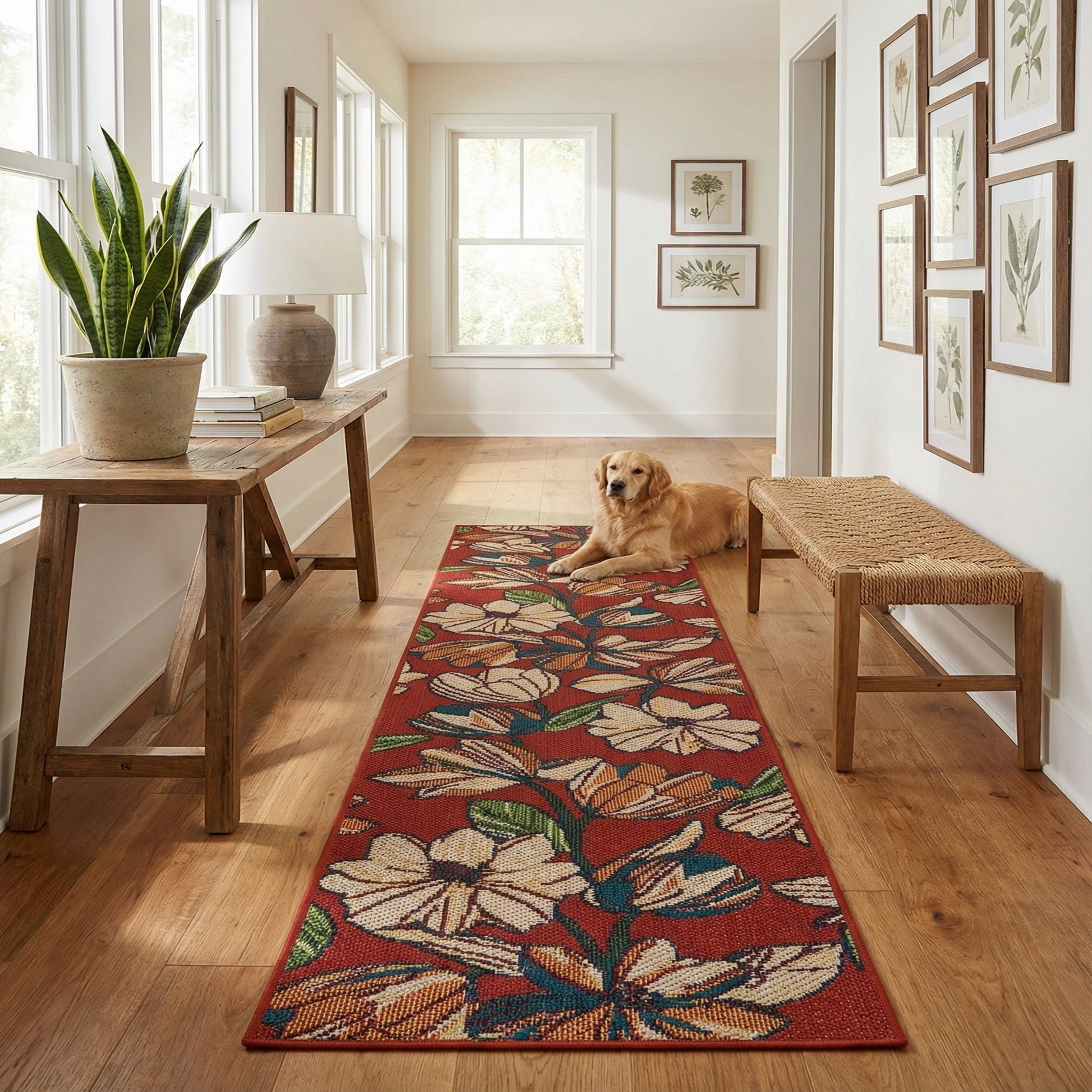 This runner works well in a long entry, kitchen aisle, or covered porch where a warm, colorful anchor is needed. Pair it with natural wood furniture, woven rattan seating and neutral linen upholstery for a relaxed, cottage or coastal vibe, or use with warm leather and metal accents for a more eclectic, rustic-modern look. The rust red base and pops of blue, green and orange make it easy to coordinate with terracotta, denim blue or ivory textiles and accessories.