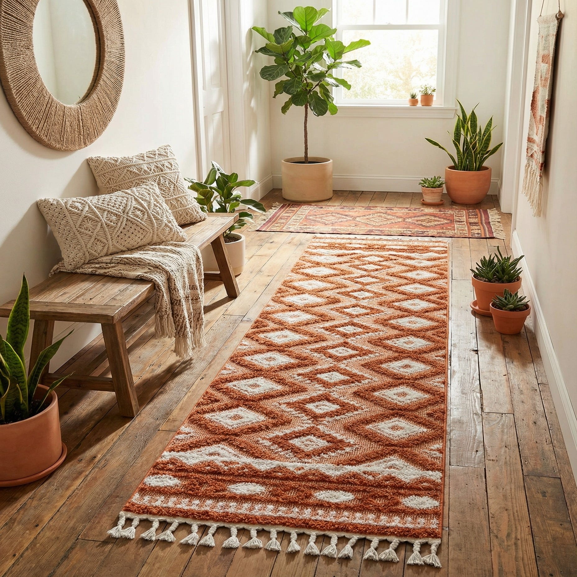 This runner is well-suited for eclectic, modern, and bohemian interiors, complementing natural wood elements, neutral color palettes, and spaces adorned with earthy textures. It could elegantly line a hallway or define a narrow kitchen space, adding both artistic flair and practicality to your home decor.