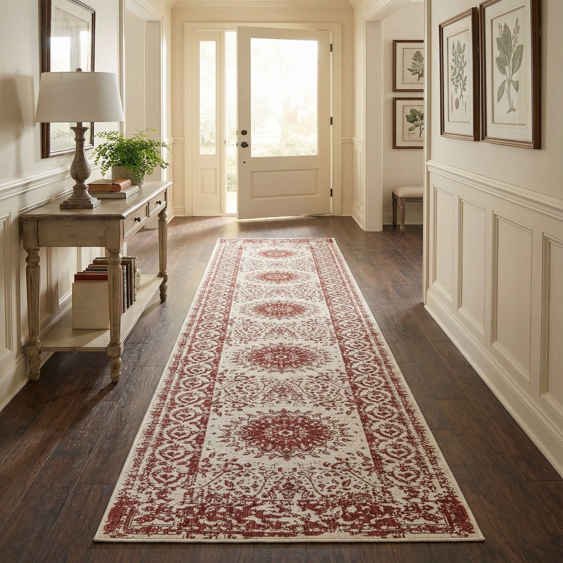 A 12 ft runner rug with a distressed red medallion and traditional pattern on a light beige background, suitable for a hallway or patio.