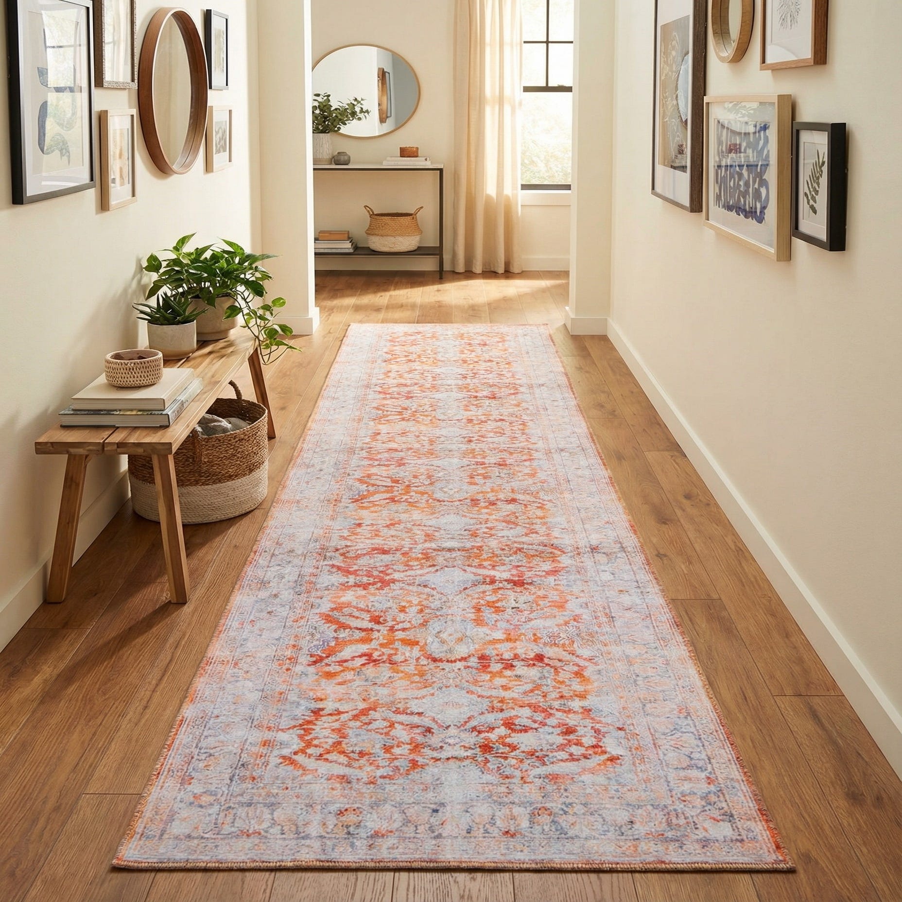 Machine made of 100% polyester, the surface has a low, dense pile with a soft, slightly silky hand that feels comfortable underfoot while holding detailed pattern definition. This runner works well in a hallway or narrow entry, along a kitchen galley, or beside a bed to add color and pattern without crowding the space. Pair it with warm wood floors and neutral walls for a cohesive look, or combine with mid-century or eclectic furnishings and brass accents to emphasize the rug’s warm hues and layered personality.