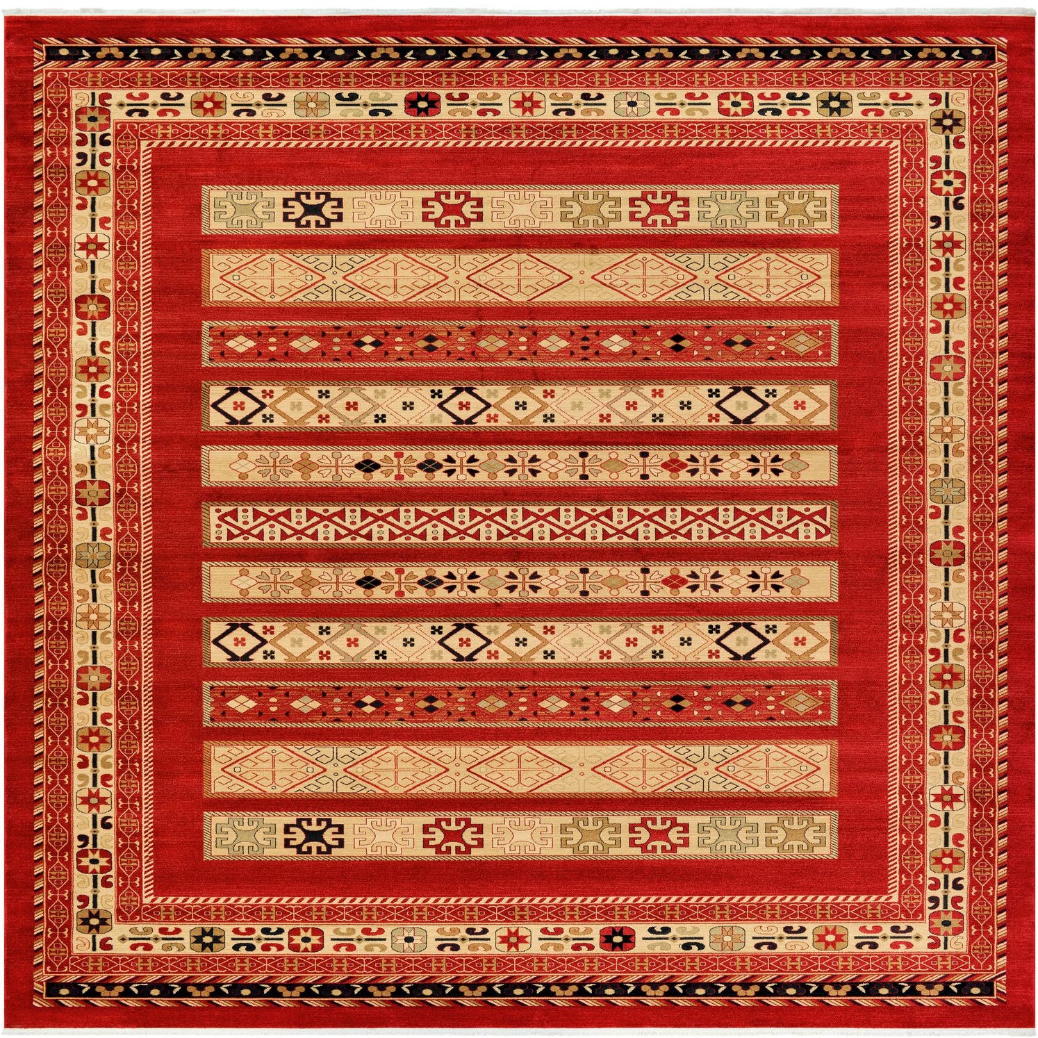 Primary color is Rust Red. Colors in this rug include: Rust Red, Beige, Black, Light Blue, Light Brown, Light Green.